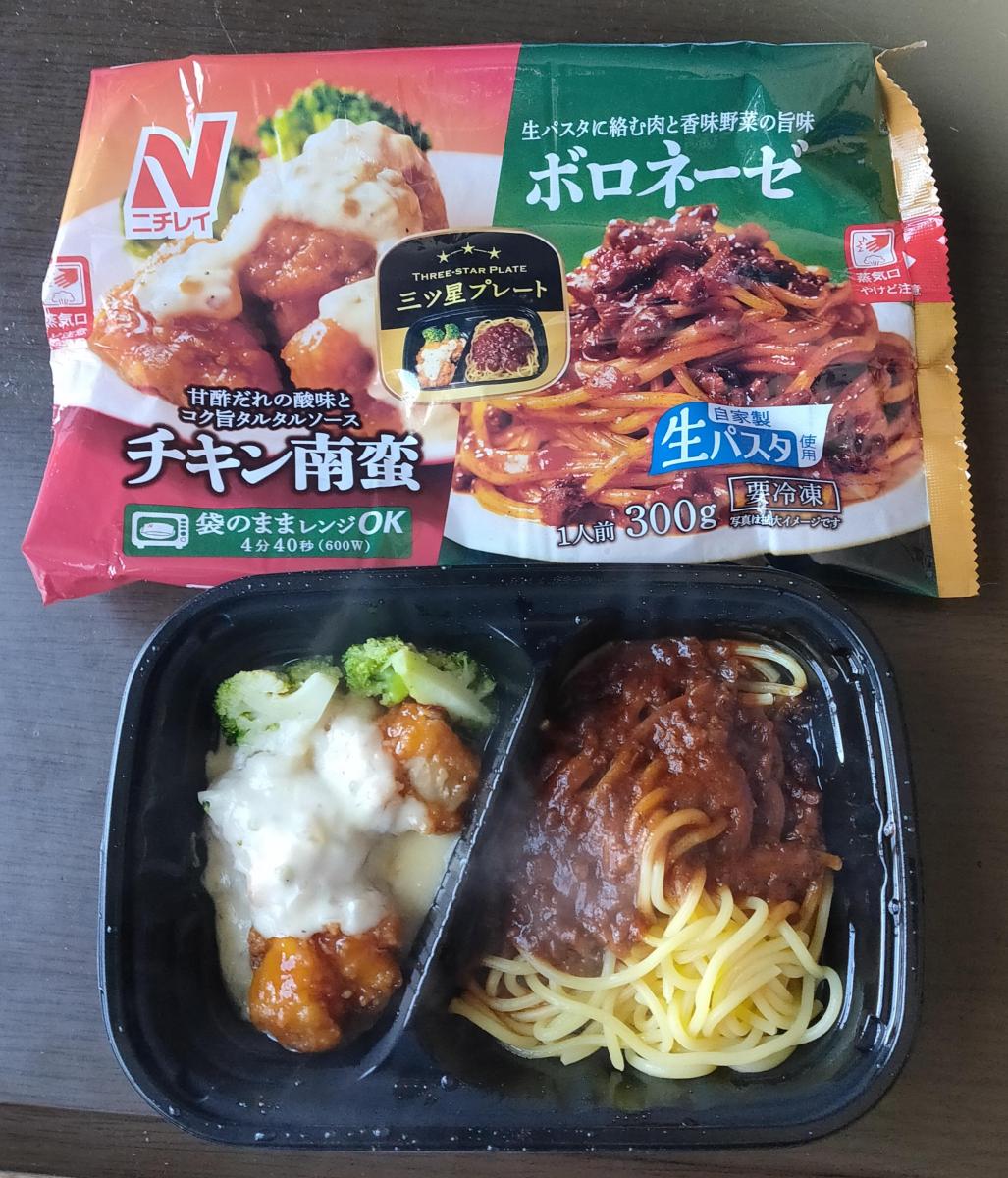 冷凍食品のパスタを買うつもりで売り場に行って見つけた商品です。パスタとおかずがひとつになっていて忙しい時に最適な商品です。チキン南蛮は鶏肉がプリッとしていて柔らかかったです。パスタのボロネーゼはひき肉たっぷりで濃厚でした。ボリュームはそれほど無いので女性におすすめな商品です。