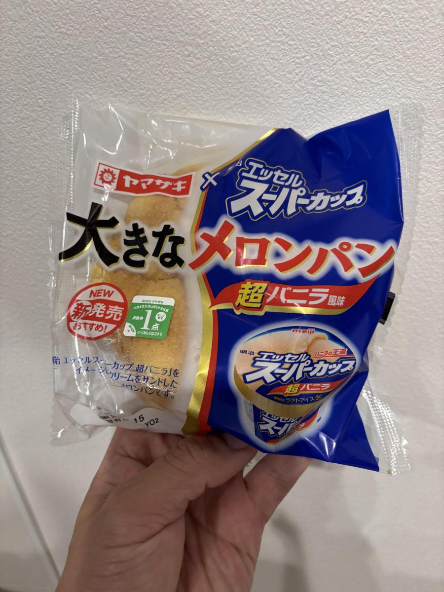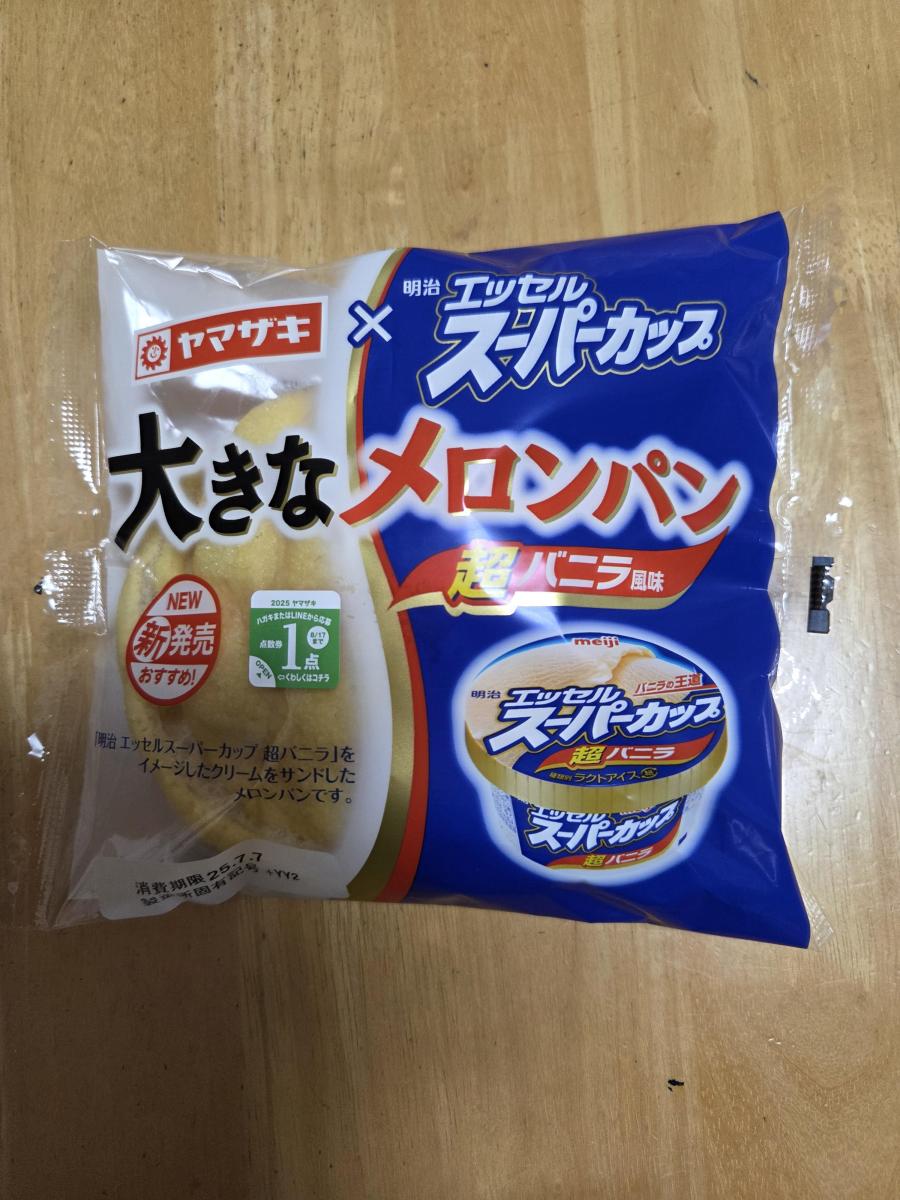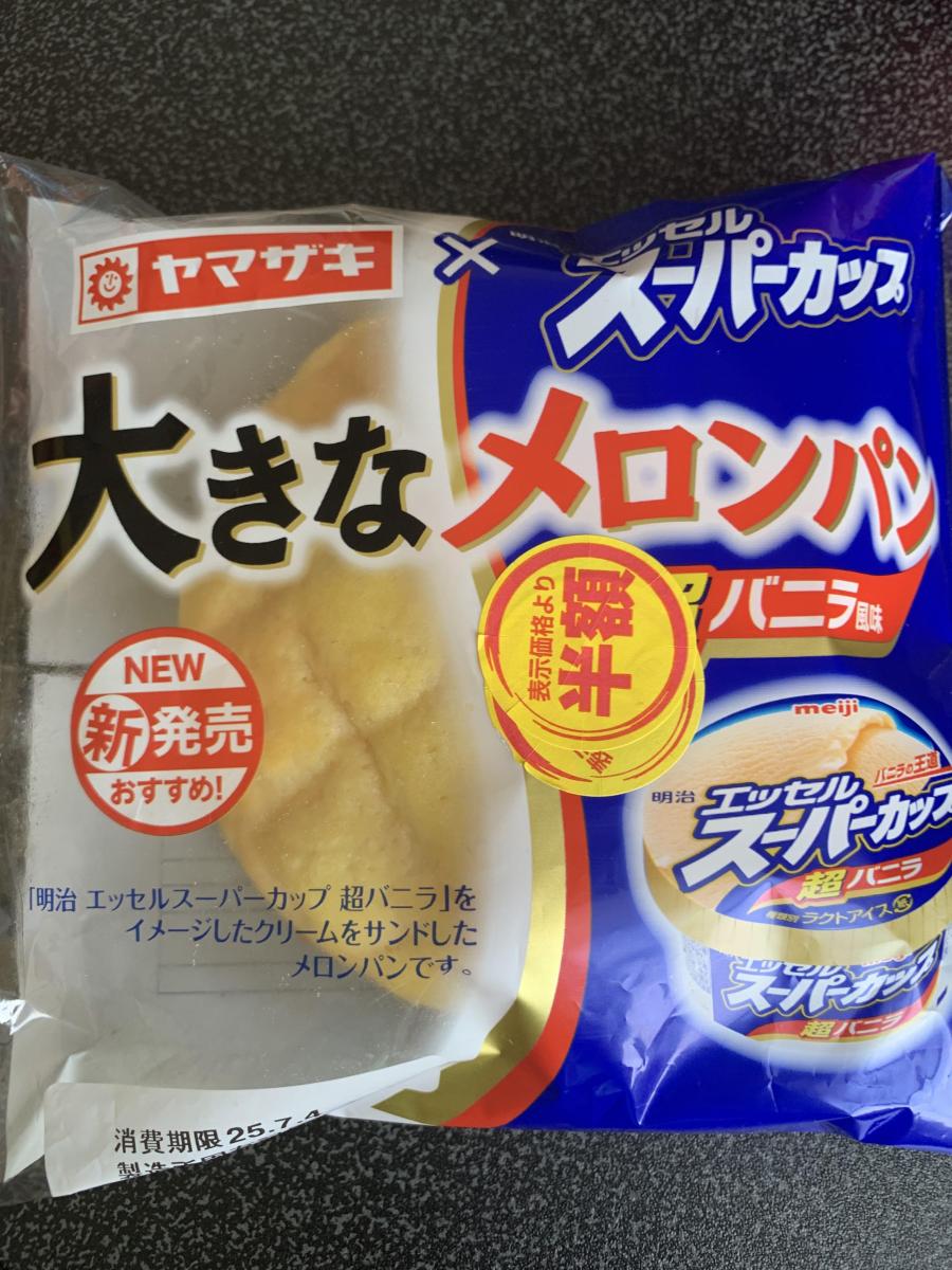 めちゃくちゃ大きいのと、スーパーカップのパッケージが目を惹きます。メロンパンの中にバニラ風味のクリームが入っていて美味しいです。クリームの美味しさと大きさが魅力です