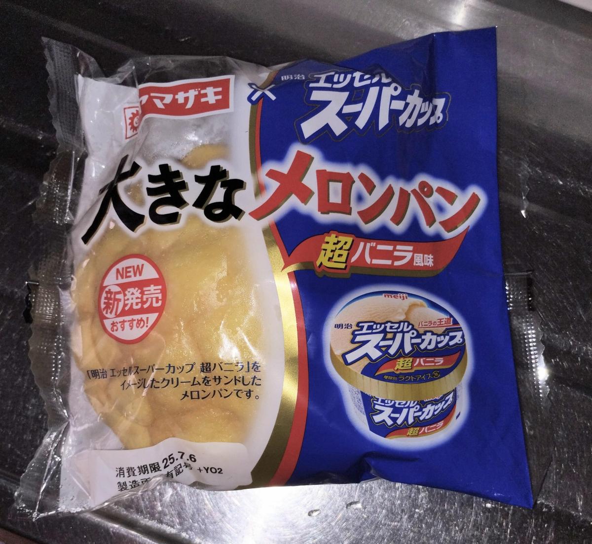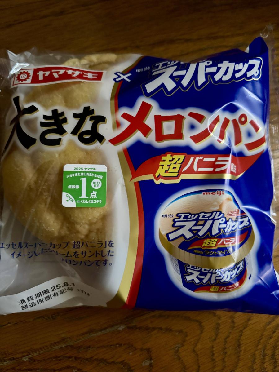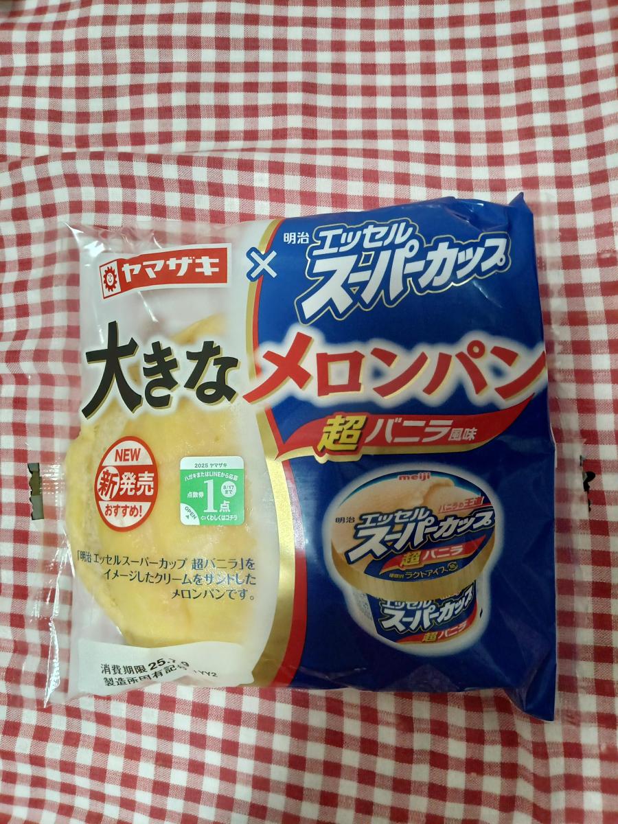 めちゃくちゃ大きいのと、スーパーカップのパッケージが目を惹きます。メロンパンの中にバニラ風味のクリームが入っていて美味しいです。クリームの美味しさと大きさが魅力です