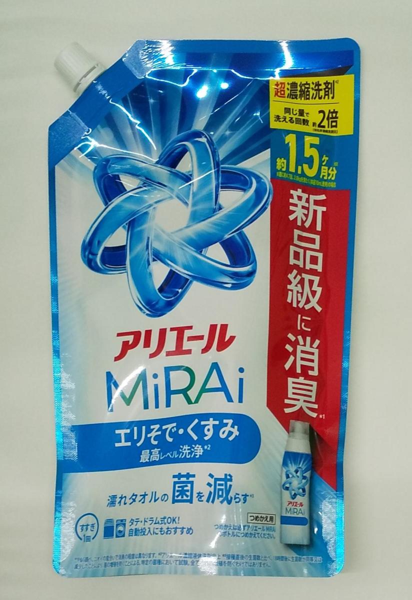 アリエールMiRAiは洗浄力が優れていて、香りも強くなく気に入りました。漂白剤級の洗浄力があるという宣伝どうりに衣類やタオルが真っ白になり満足です。詰め替えもあるのでコスパが良いです。