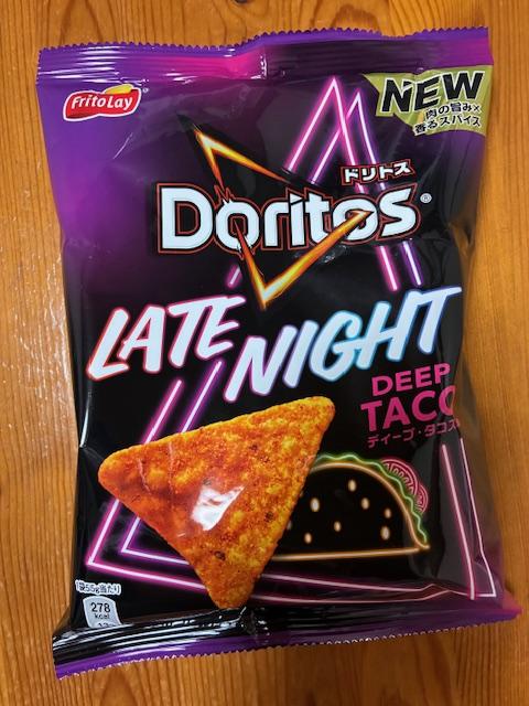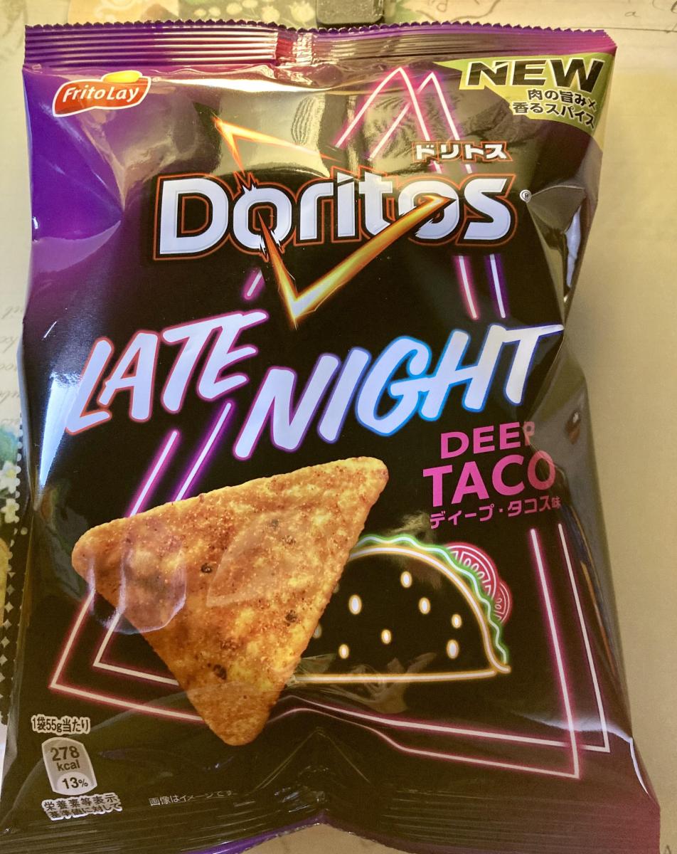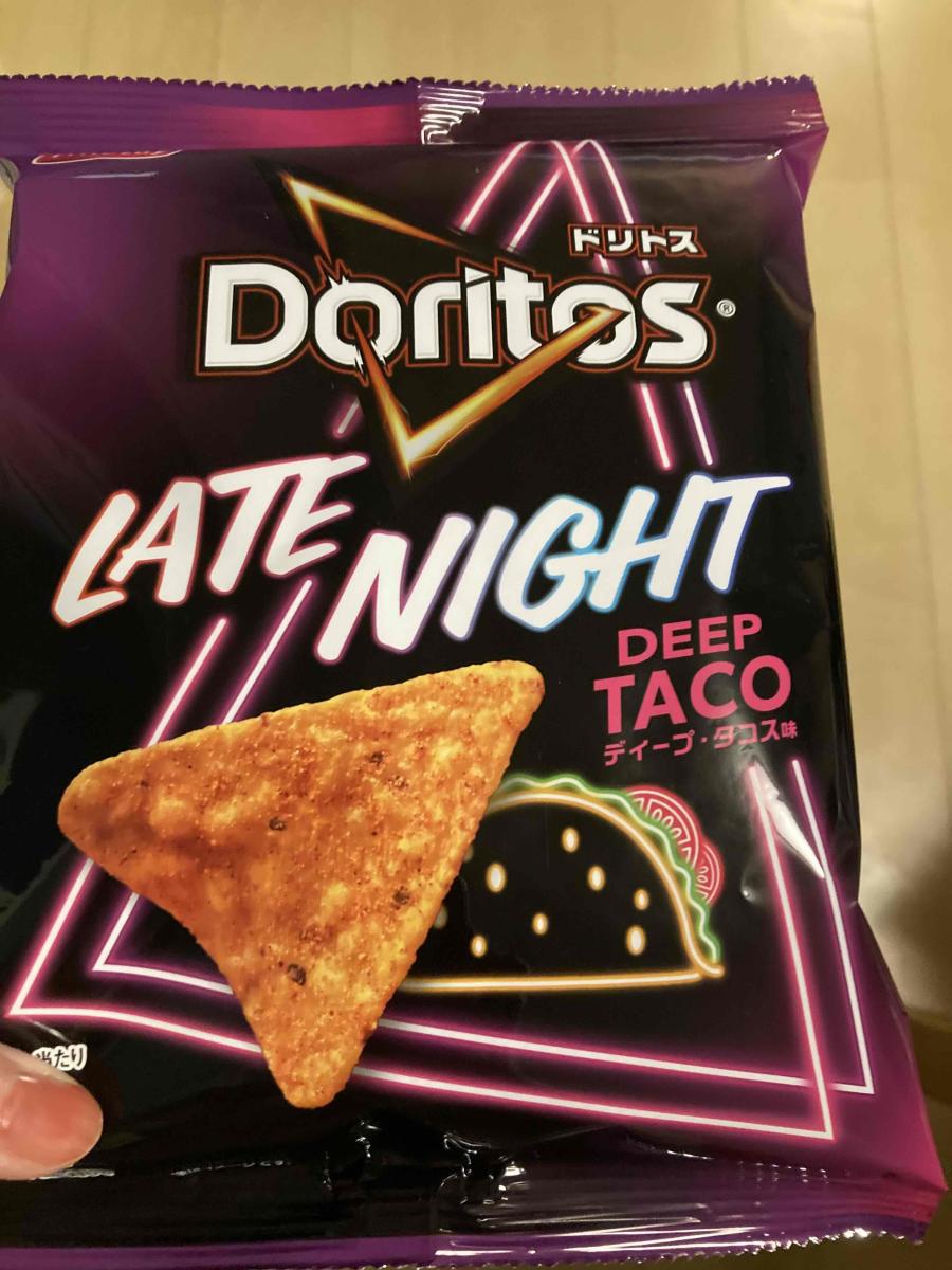 ドリトス LATE NIGHT ディープ・タコス味のネーミングとパッケージに目が惹きどんな味か試したく購入してみました。三角形のトルティーヤチップスは、パリっとした食感の香ばしいコーンスナックの食感で、味はかなり塩気が効いた強いフレーバーにかんじました。チーズ感はほぼ感じなかったのが残念です。コスパはいいです。