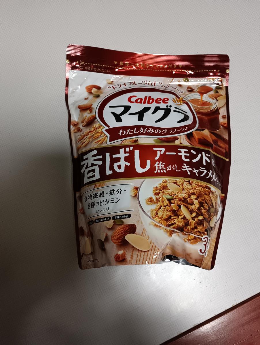 お得になっていた商品コーナーで見つけました。フルグラは好きでよく購入するのですが、マイグラ?のフレーズを初めて聞いたので購入しました。開封すると香ばしい。アーモンドと焦がしキャラメルどちらも良く美味しそうに香りをひろげてくれます。大人っぽい感じですが、甘さも忘れずしっかりと歯ごたえもあり、子ども達も喜んで食べています。かぼちゃの種、スライスアーモンド、クラッシュアーモンドとシンプルなナッツの組み合わせでグラノーラには程よくキャラメルがついています。プリンの苦めのカラメルソースを食べている感じで、子ども向けにもなります。家族みんなで楽しく美味しくいただきました。