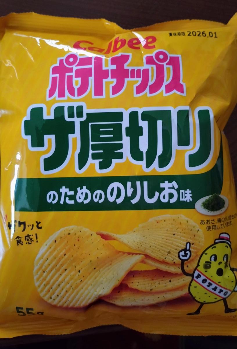 カルビーポテトチップスザ厚切りのためののりしお味はドラッグストアで購入しました。ノーマルのポテトチップスと比べて厚みは結構あり、表面がジグザグなので、かなり噛み応えがあります。あおさ、青のり、焼きのりが使用されていて、磯感もあり美味しかったです。