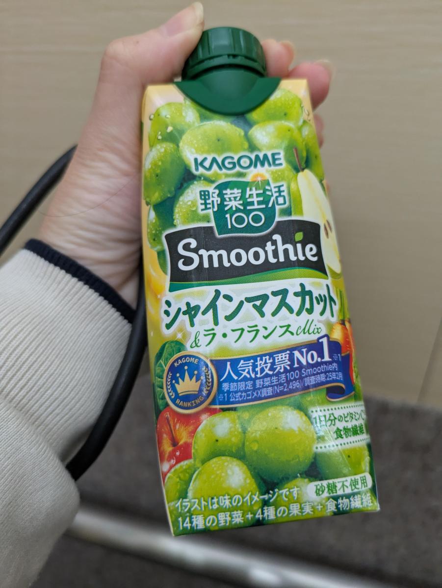 スムージーなのでジュースより飲み応えがあり、小腹を満たしたい時に良さそうです。シャインマスカットとラ・フランスの組み合わせなので、甘さはありながら後味はさっぱりしており、ゴクゴク飲める感じでした。また買いたいです。