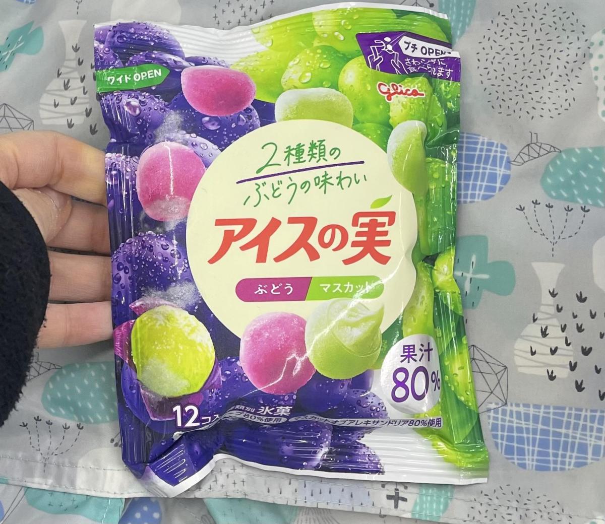 マスカットとぶどうが2種類楽しめて、味も濃くてまさに冷凍の葡萄を種無しで食べてる感覚。手が汚れない設計も嬉しい。けど、溶けやすいのが難点。冷房効いた部屋じゃないと、丸が溶けてくる