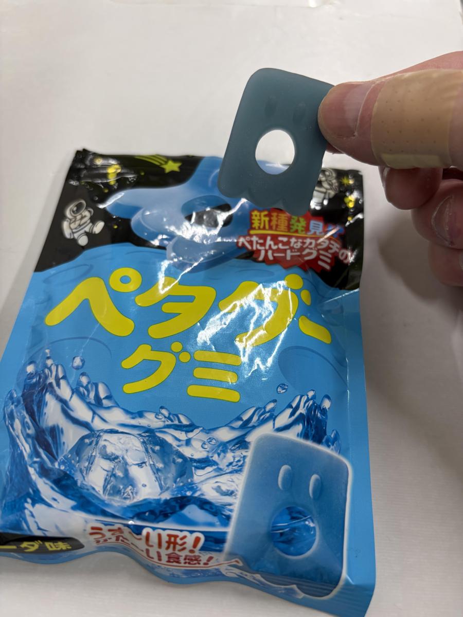ペタグーグミ、薄くてハードな食感が不思議で魅力があります。別の味が美味しくてソーダ味も迷わず購入しました。見た目より青色が濃くびっくり、味はライトなソーダ味です。噛みながらリフレッシュできていいですね。