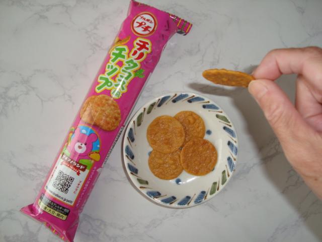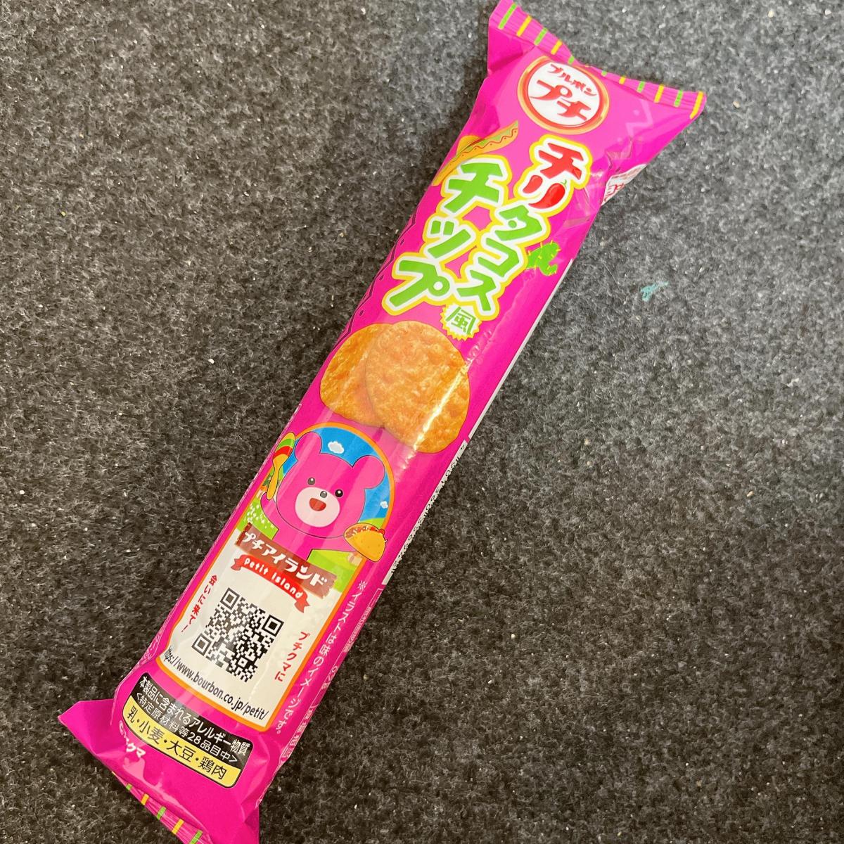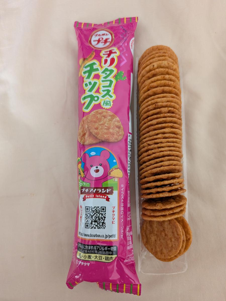 ブルボンのプチシリーズはフレーバーの種類が豊富で楽しいですね。こちらの商品については、軽い食感のおせんべいがベースで、スパイシーなチリタコス味です。せんべいとの相性はいまひとつですね。ポテトの方が良いかもしれません。