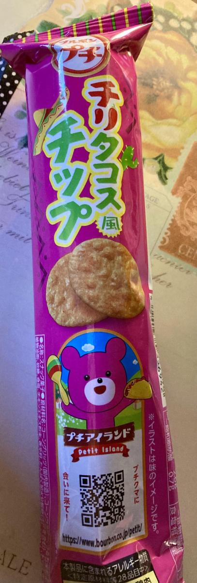 プチチリタコス風チップ味を食べた事がなかったので気になり購入してみました。生地はうるち米粉も入っているためせんべいのような見た目とカリカリサクサクした食感がとてもいい感じです。味もピリ辛のタコス味でメキシカンな感じで、食べ進めていくとしょっぱくて辛さがじわじわとやってきます。おつまみにもぴったりな味わいだなと思います。