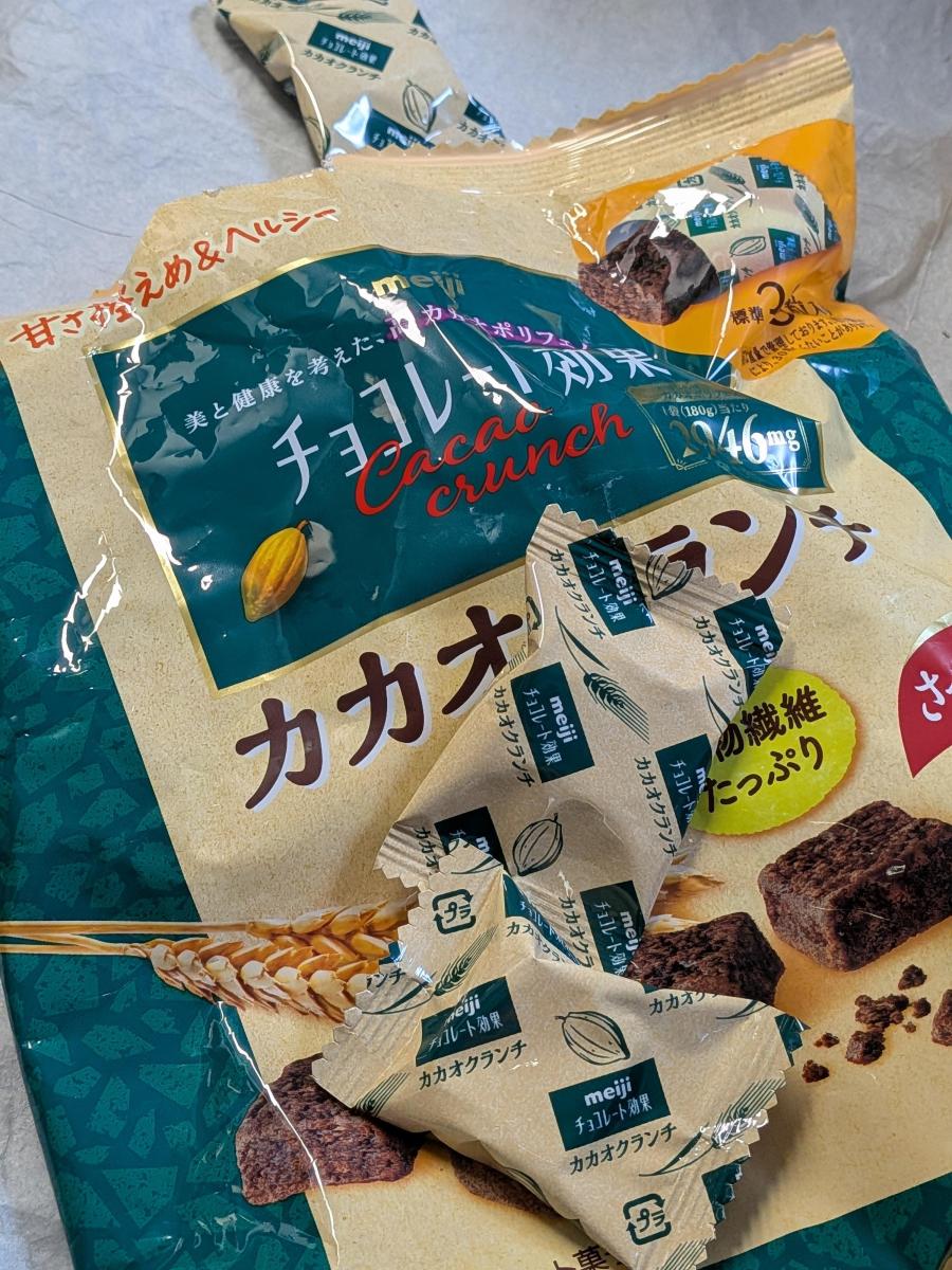 最近血糖値を気にしていて、高カカオチョコレートを色々試していますが、今回はチョコレート効果のカカオクランチを試してみました。