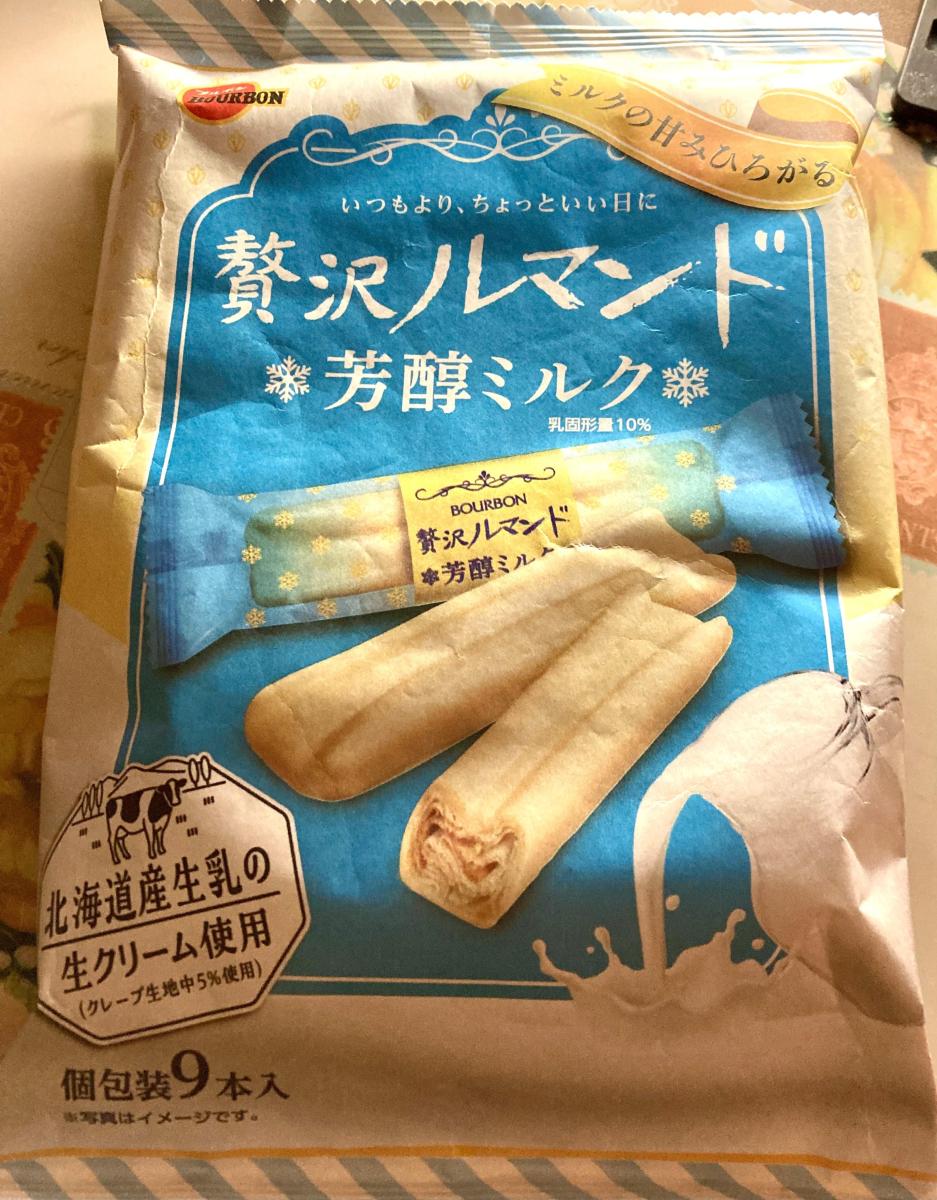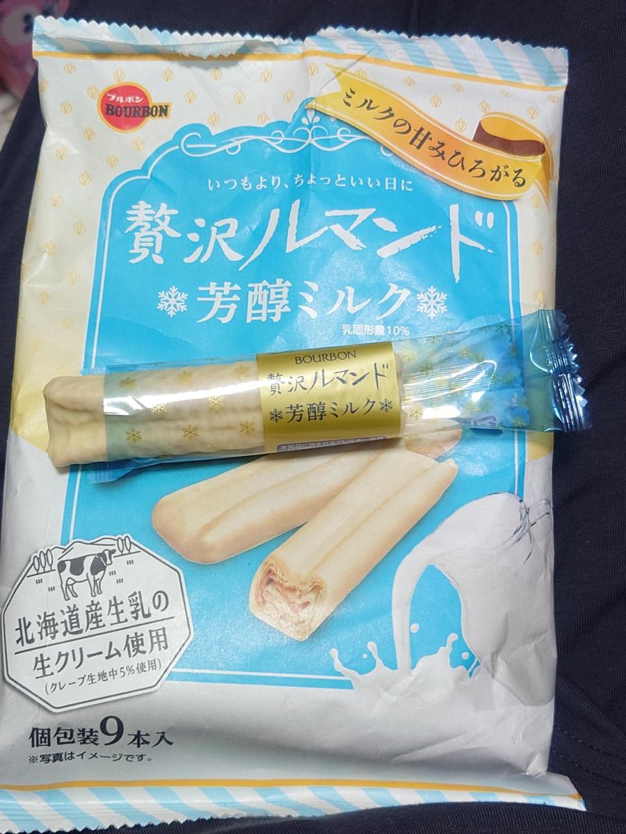 お得になっていた商品コーナーで珍しいのを見つけて購入しました。定番商品のルマンドが大好きです。贅沢ルマンドシリーズは初めて購入しました。パッケージ袋が紙というエコな所もいいですね。開封すると見た目は定番商品のルマンドと形はかわらず、色がミルク色の白です。食べてみると、口の中で濃厚なミルクのまろやかで甘い美味しい味がじわりじわりとひろがります。本当に贅沢にミルクを使っているという感じがすごく伝わります。外側のミルククリームのコーディングがその役目を果たしていて、中のクレープ生地にもミルクを少し使用しているとのこと。サクッと食べると、バターの旨味がして、ミルククリームと合わさることで贅沢にミルク感が味わえます。とても美味しくいただきました。