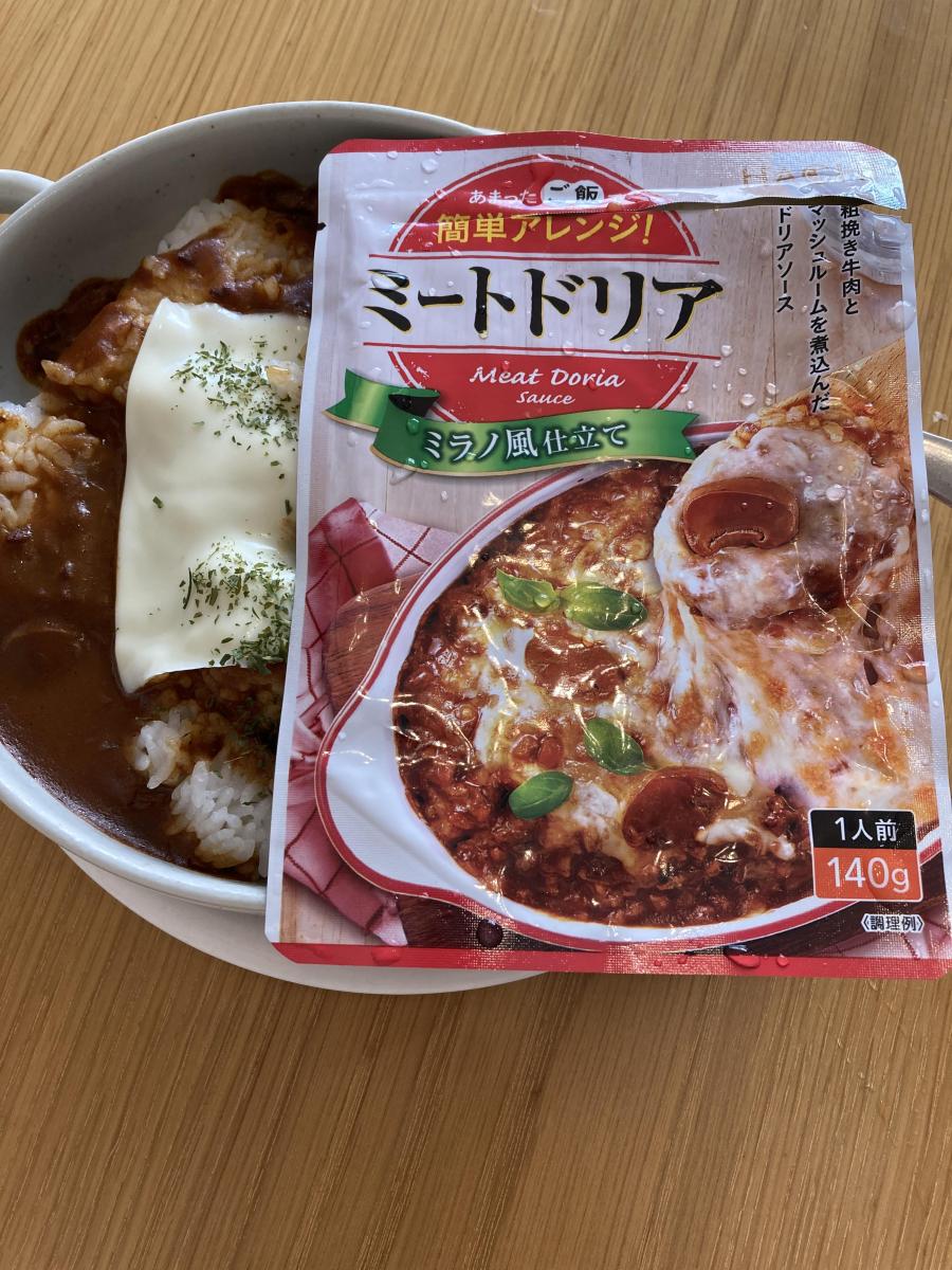 そのままソースを舐めてみると、トマト由来なのか酸味のあるミートソースだったのですが、ご飯にかけて熱すると酸味が幾分かやわらいで、ちょっとトマト風味のあるまろやかデミグラスソーといった味わいになっていました。自身はご飯だけでなく、余っていた豚の細切れを焼いて入れていたので、それこそ出来上がりはハヤシライスというか、ビーフシチューがけライス、みたいな味になっていました。トッピングとしてシュレッドチーズや青粉もかけました。私は肉を入れてしまいましたが、ドリアソースには挽肉らしきもの(純粋な肉だけでなく大豆ミートも混ざっているかもしれない)やマッシュルームもちらほら入っているので、特段具を追加しないでもご飯さえあればコクのあるミートドリアを作ることができると思います。ハチ食品といえば、パスタソースやレトルトカレーは大容量のイメージがありますが、この商品は140gで1人分コンパクトな容量でした。(2025年夏現在)