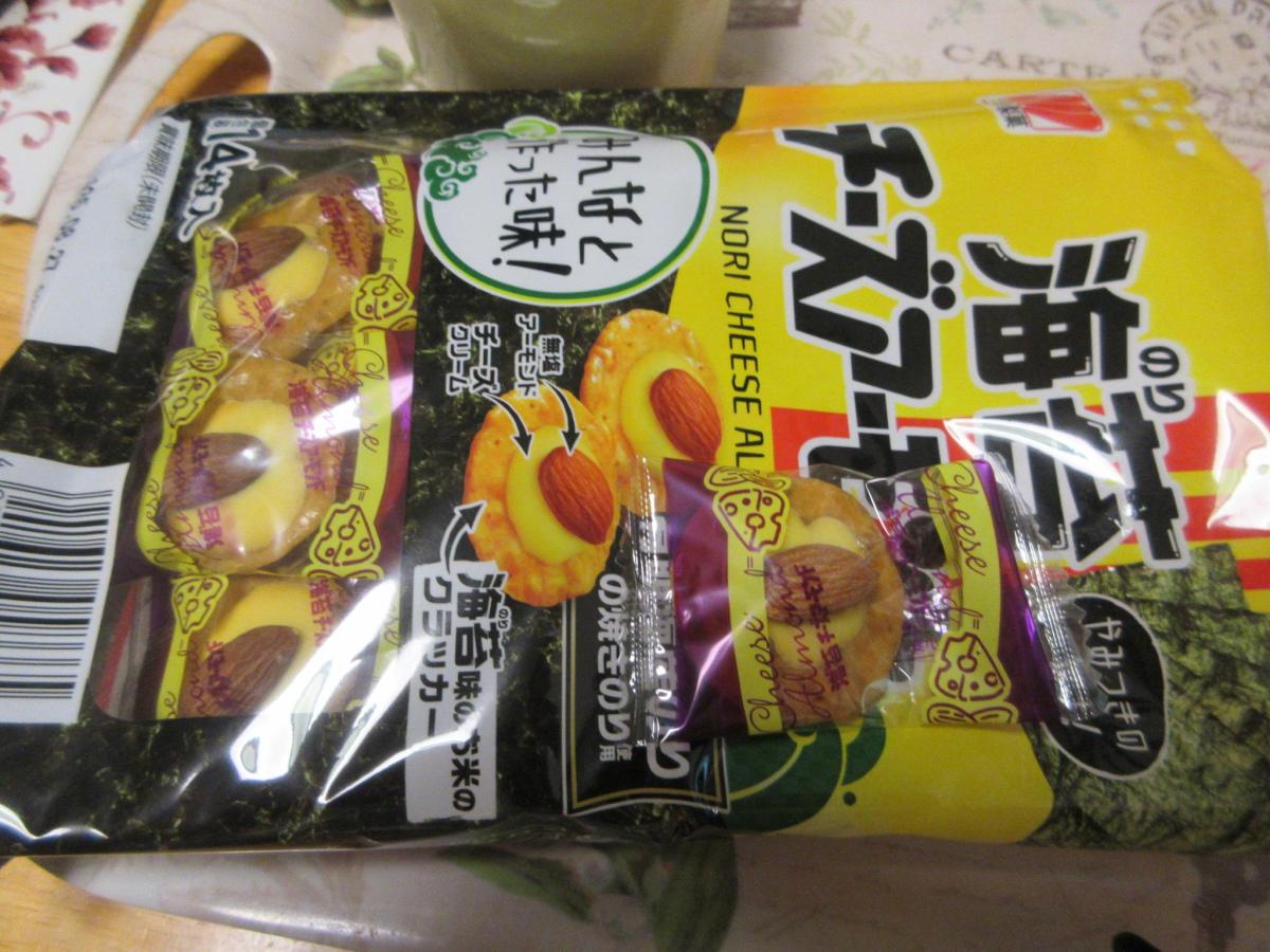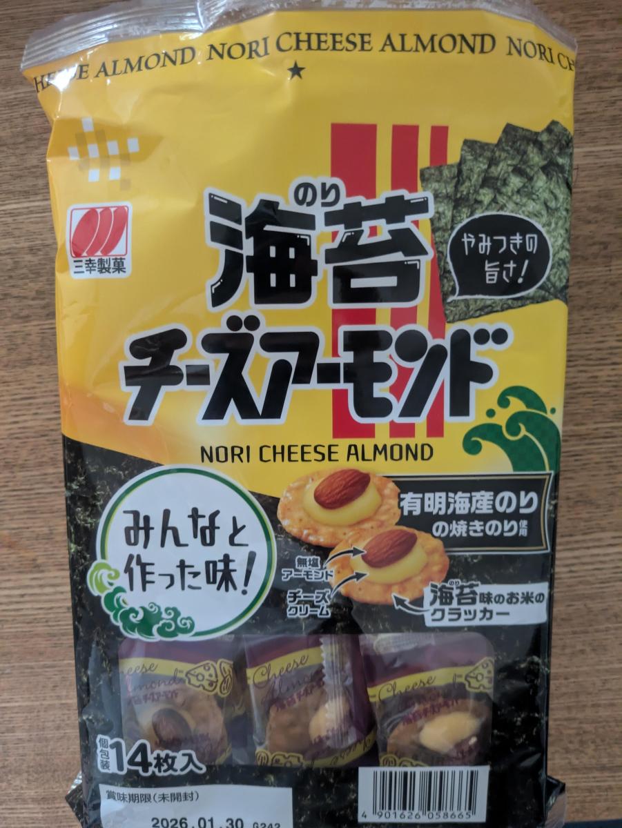 海苔味の煎餅ではなく、単純に海苔にチーズアーモンドを乗せただけのほうが美味しいんじゃないかなと思いました。