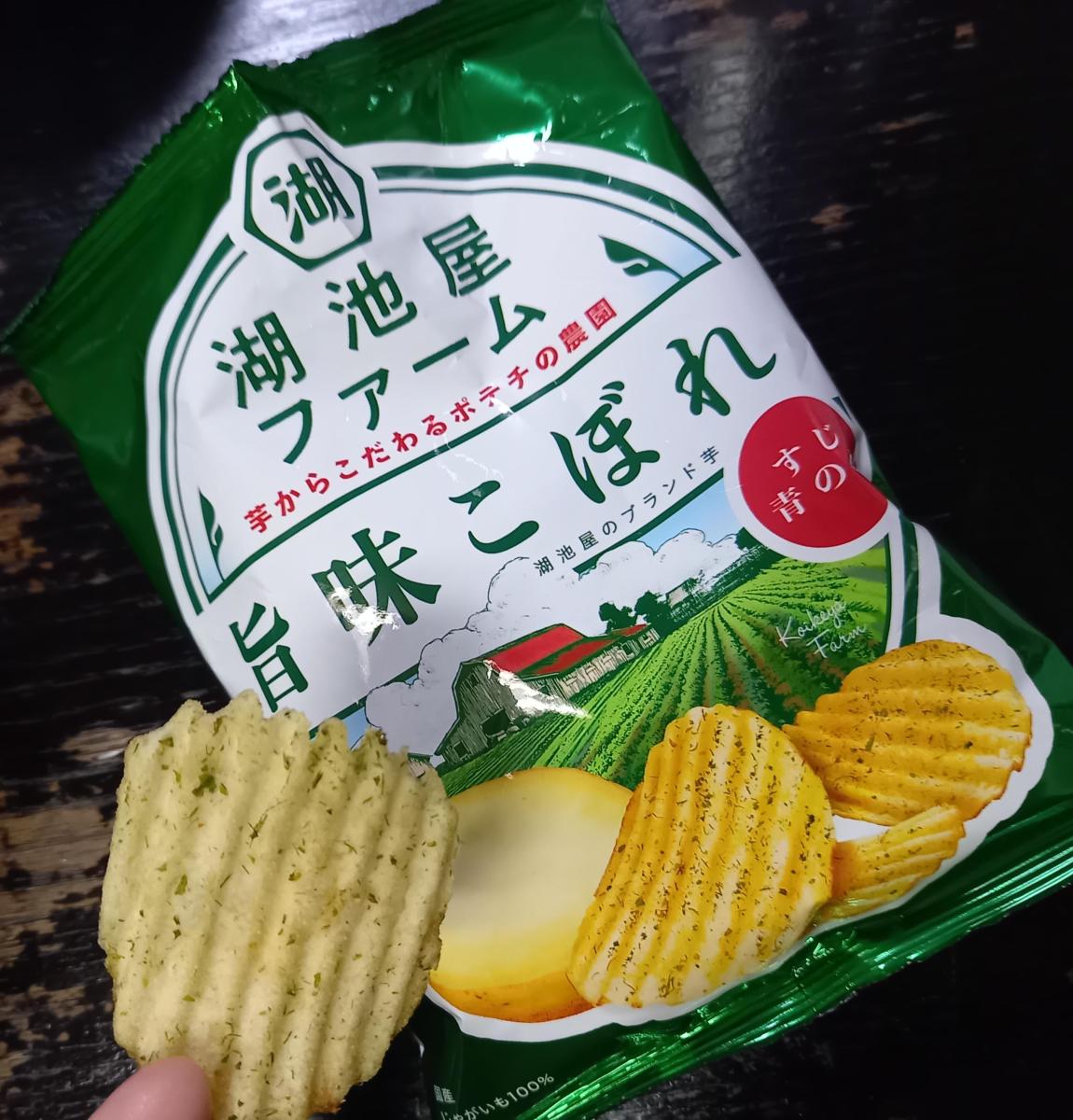ポテチは波型のクリンクルカット、少し硬さのあるサクザクッ良い食感。青のりの良い風味、やや塩っ辛い、のり塩味。揚げてる香ばしさ、お芋の味もしておいしいけど、少し塩っぱいかな。