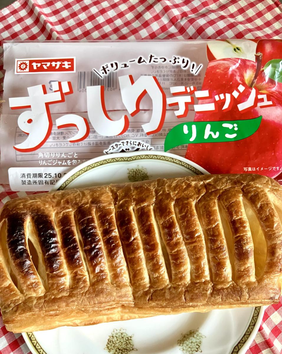大きなデニッシュパンで、お得感があります。中に甘く煮たりんご煮が敷き詰められていて、まるでアップルパイのような味わいです。トースターであたためると、焼きたてアップルパイのようでした。