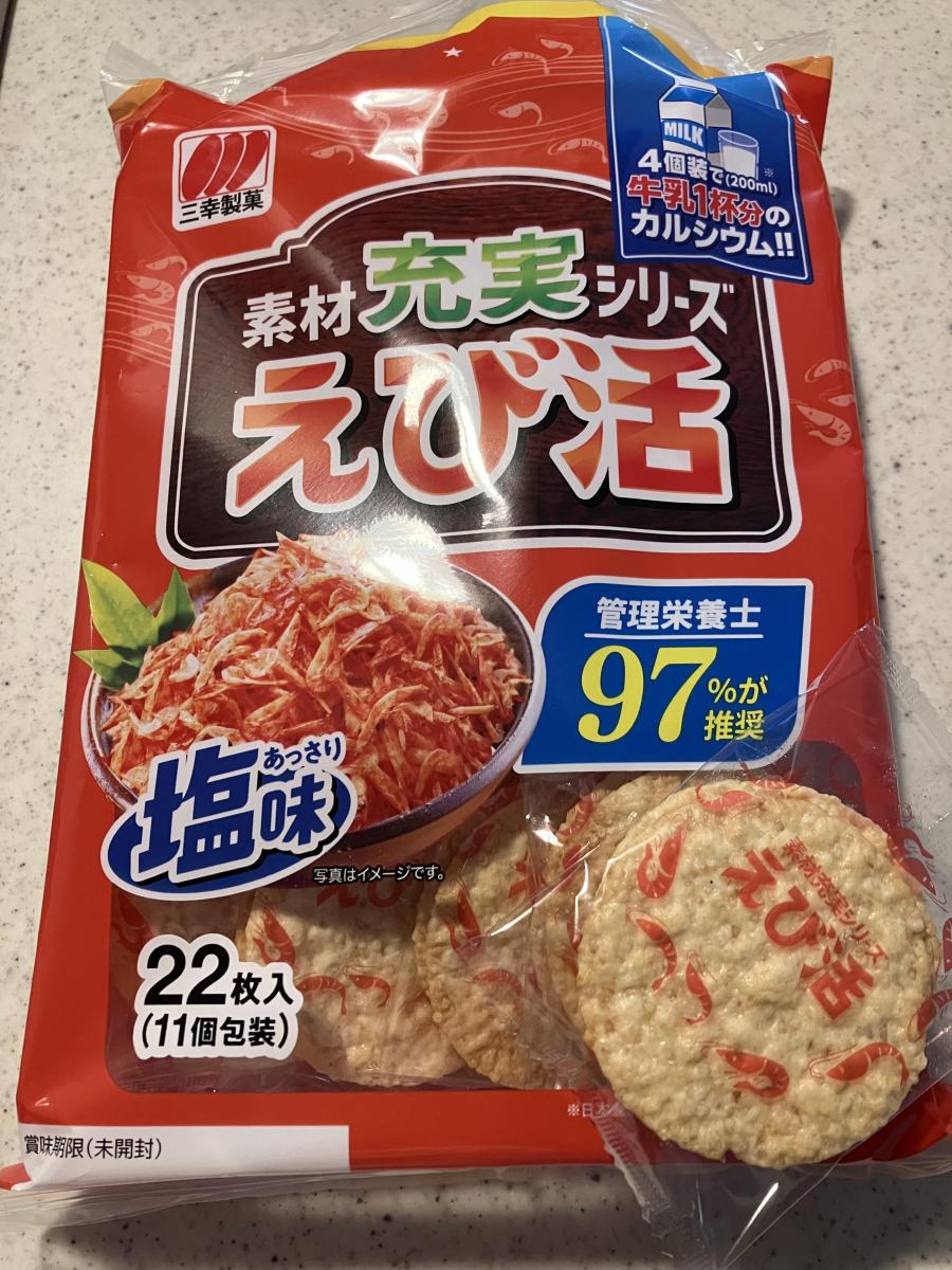 管理栄養士さんの97%が推奨してるなんて、身体に優しそう。いざ実食!エビの風味がしっかりある薄めのお煎餅。お米を感じるぼこぼこ感もアクセントになって、美味しい。4個装で牛乳1杯分のカルシウムも取れるので、身体にもいいですね^_^