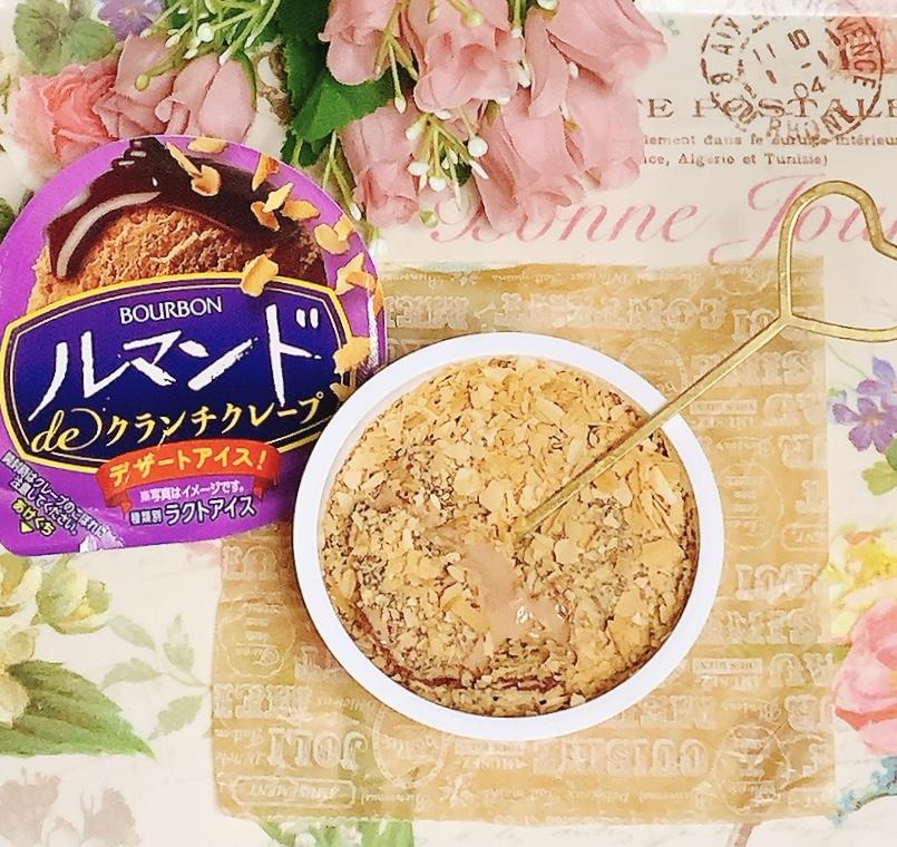 ルマンド de クランチクレープとルマンドでアイスってどんな味か気になり購入してみました。フタ開けるとクランチクレープが細かく散りばめられており、サクサク食感はいいですが、アイスを少し溶かしてから混ぜないと粉がこぼれまくって大変食べにくいです。チョコレートは濃厚なカカオの味が感じられ下側のモカアイスの甘さと合わさっておいしかったです。
