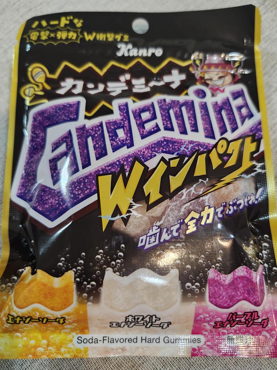 Wインパクト、とは、通常のカンデミーナの2倍の厚さ&ゼラチンの配合量でより持続する弾力感を実現したハード食感と、エナジーソーダ、ホワイトエナジーソーダ、パープルエナジーソーダの、3種の刺激的なエナジードリンク味でWのインパクトが味わえる、ということのようです。