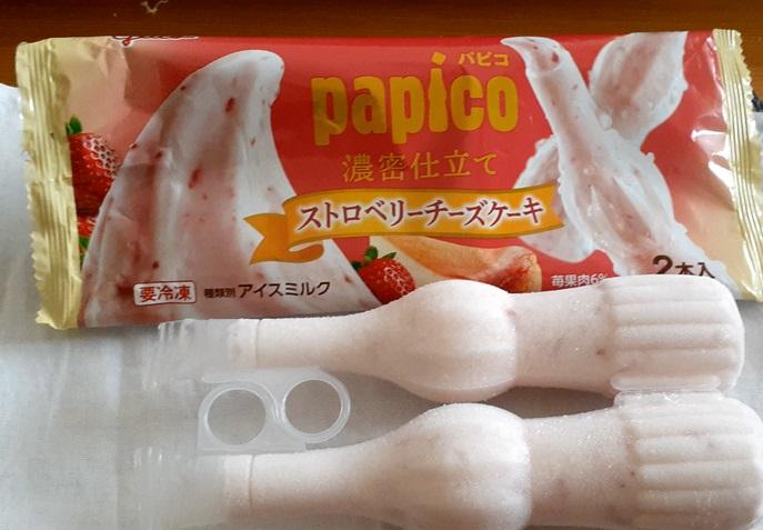 ストロベリーチーズケーキの味は再現されてますが、パピコのアイスと合うか、違和感があります。