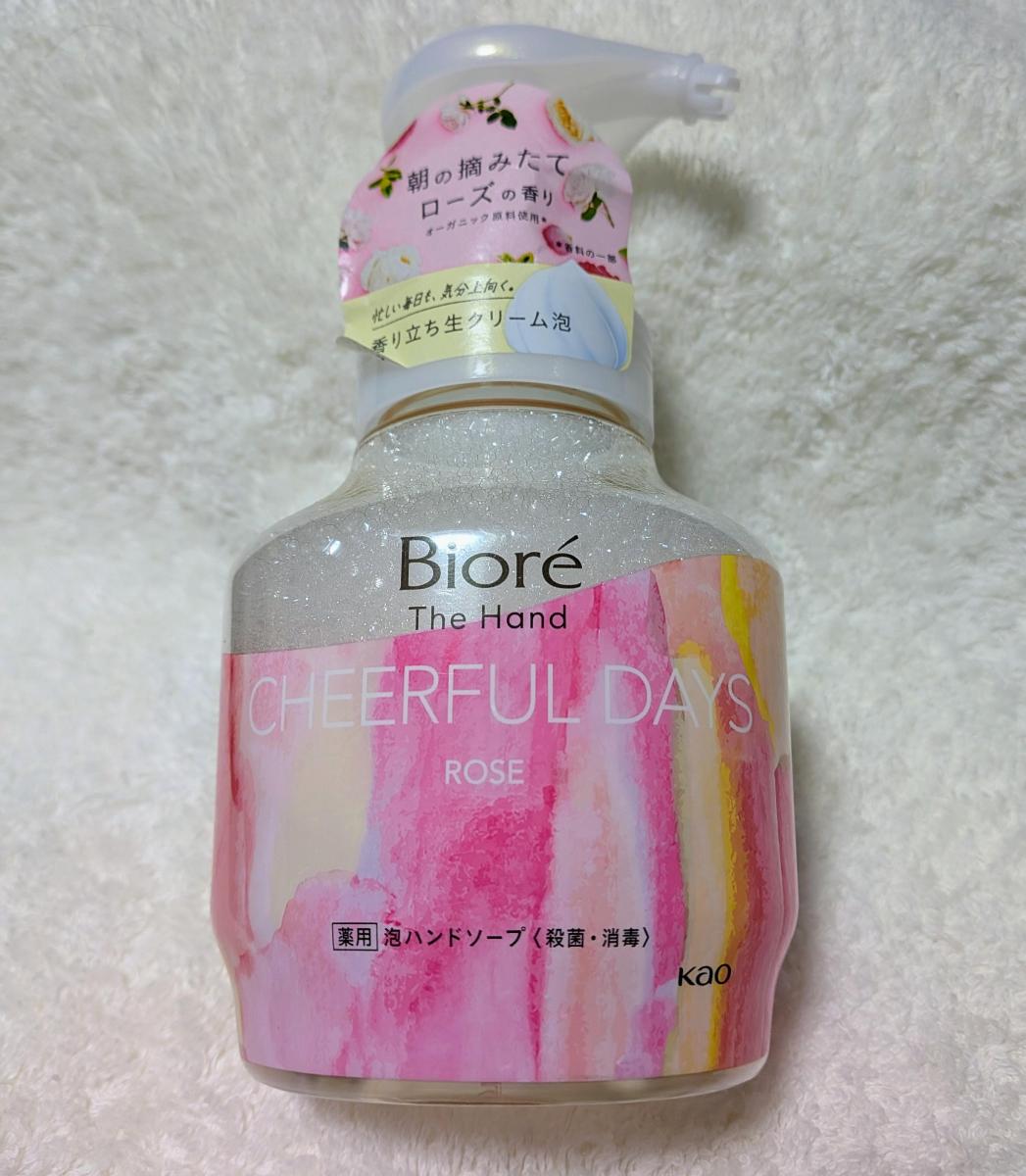 泡ハンドソープで、泡のキメが細かくてまるでホイップクリームのようななめらかさがあります。ローズの香りがしっかりして、洗ったあと、ソープを置いている洗面台周りも、手からもいい香りが続きます。しっかり香りがして、たしかにCHEERFUL DAYSと書かれているのがわかるなと思います。いい香りで、気持ちが上がるハンドソープだなと思います。