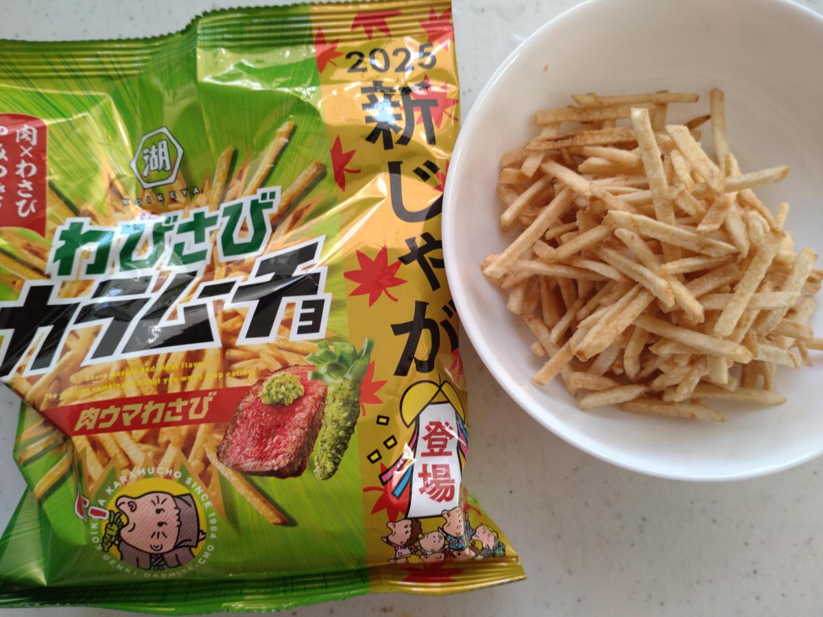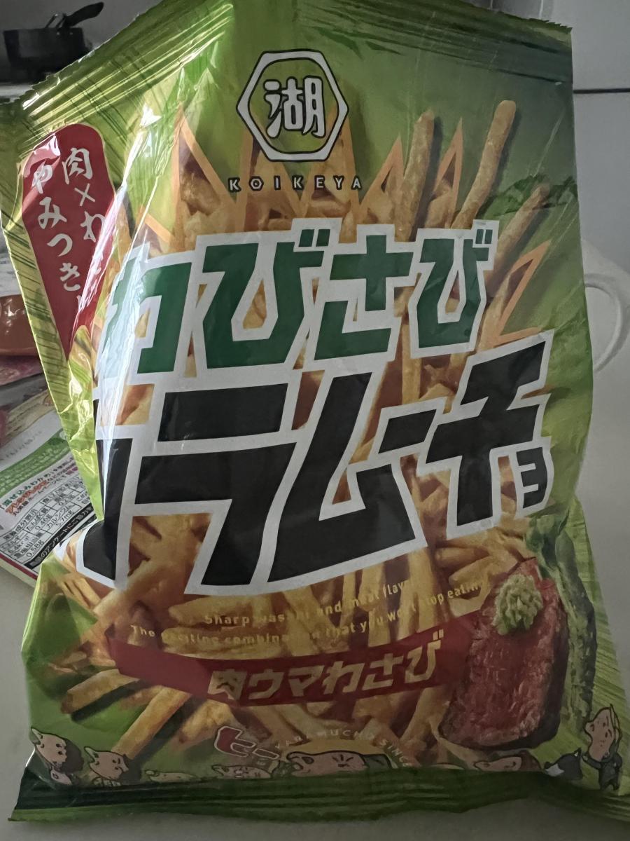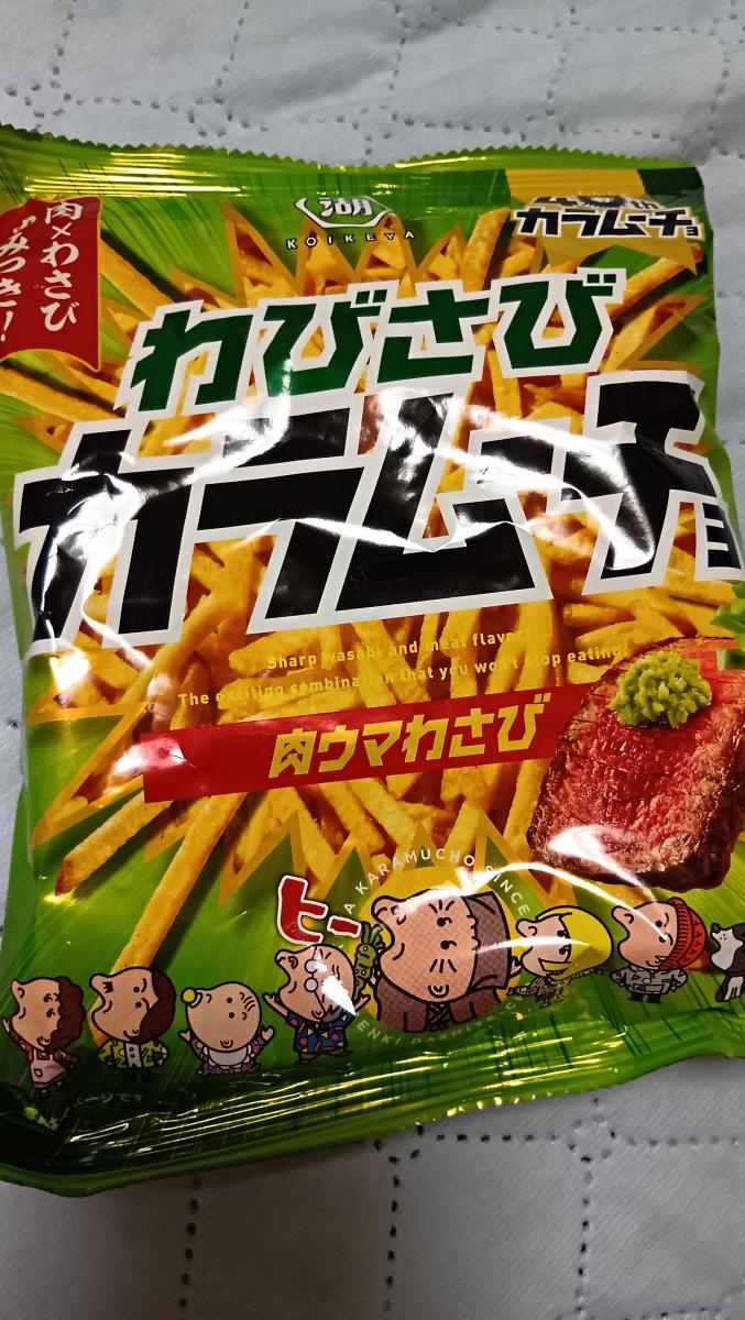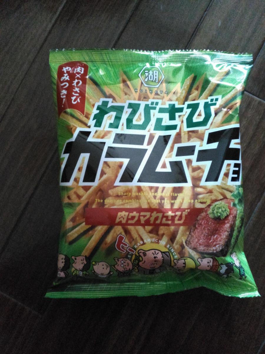 カラムーチョのわさびバージョン。わさび独特のツーンとした辛さがしっかり効いてます。わさび好きならやみつきになる味です。おつまみとしてビールと一緒に食べたらとても合いました。値段は高めですが、また食べたいです。