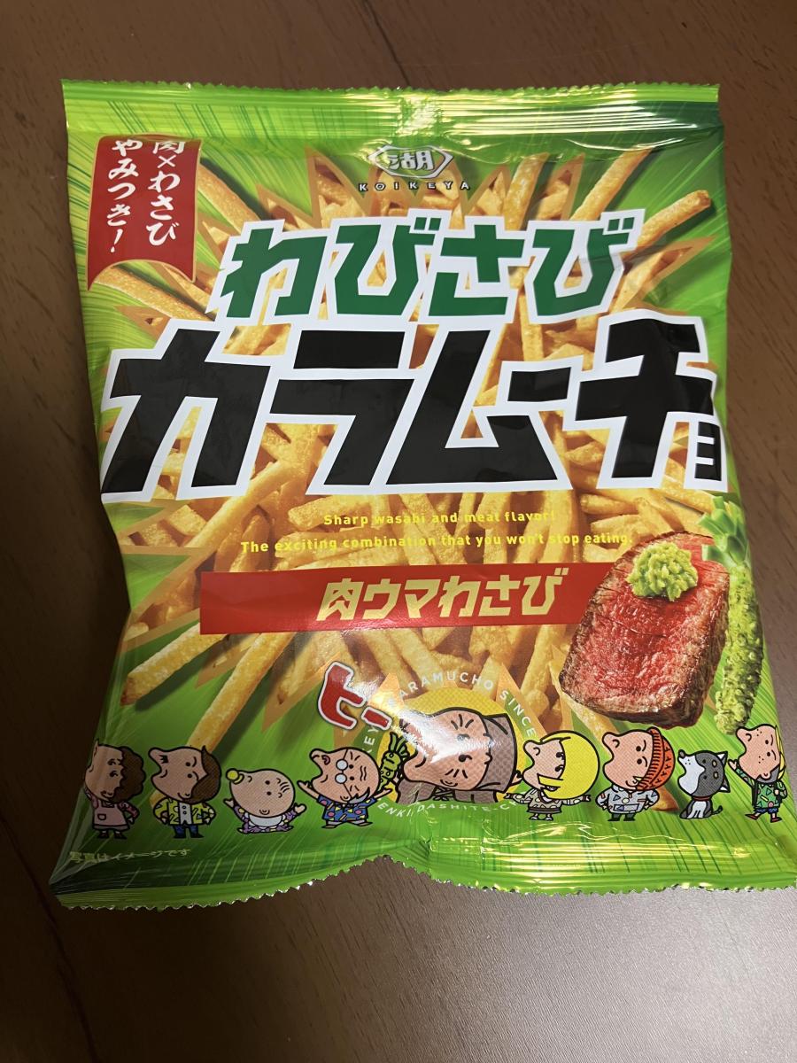 普段は、唐辛子風味のノーマルカラムーチョにお世話になっています。今日は肉わさび味を見つけたので、購入してみました。