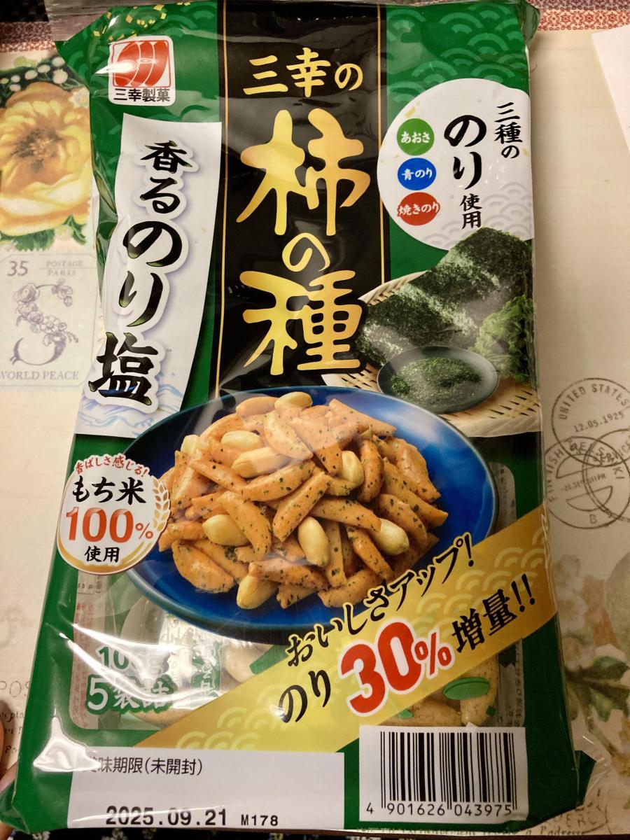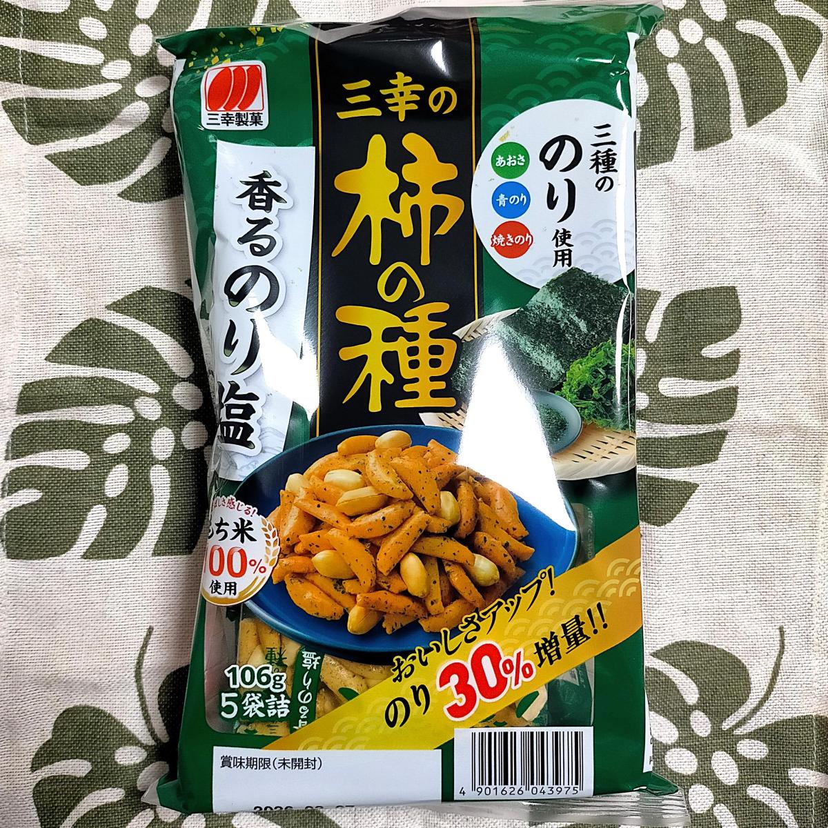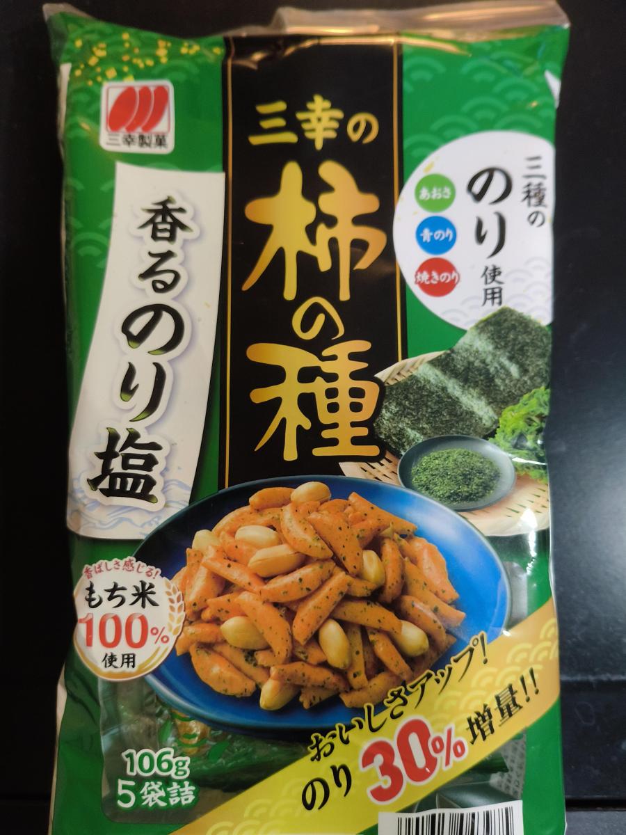 柿の種の香るのり塩味が気になり購入してみました。小分けされているのでシェアできて大変便利です。海苔はあおさ、青のり、あまのりの3種類が使用されているとの事ですが、ほんのり磯の風味が感じるぐらいで醬油の味わいの方が強めでした。いつもの柿の種の味とあまり変わらず、もう少しのり感がほしかったかな。