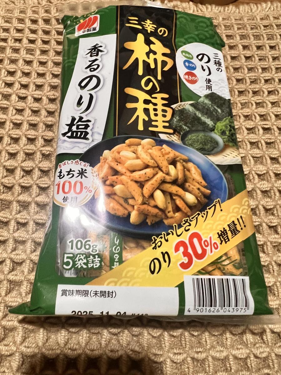 のり塩好きにはたまらない一品です。普通の柿の種と違って、ふんわりとしたのりの香りと塩加減が絶妙で、食べ始めると止まらなくなります。ピーナッツが入っていない分、軽い食感でサクサク食べられて、おやつやおつまみにぴったり。個包装になっているので、少しだけ食べたい時にも便利です。のりの風味がしっかりしていて、ポテトチップスののり塩が好きな人ならきっとハマる味だと思います。リピート確定です。