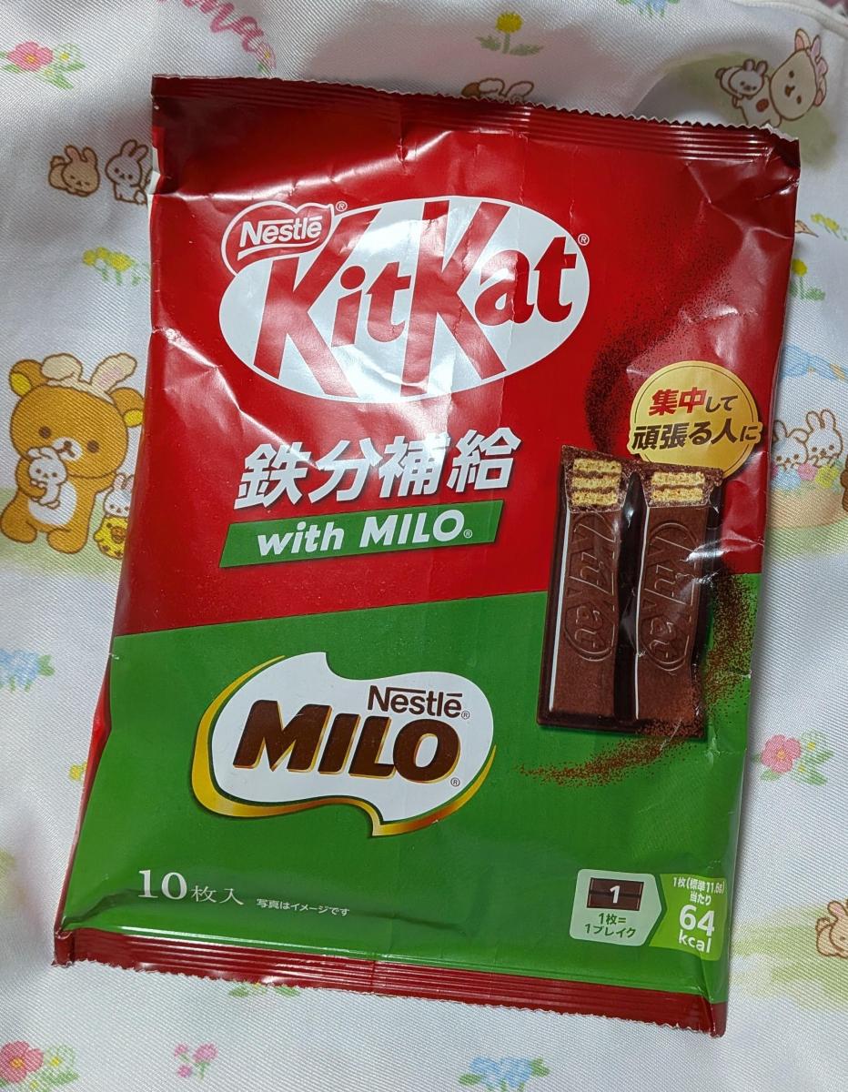 ネスレのふたつのブランドがコラボした新しいチョコです。ミロのパウダーが配合されているようで、キットカットを食べながら鉄分が補給できるヘルシーチョコです。