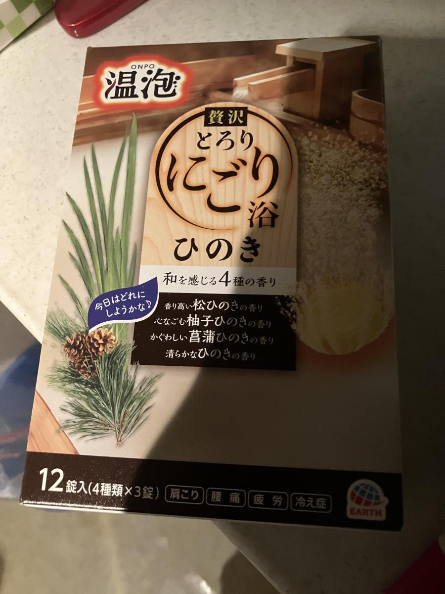 昔はバフを買ったりしていましたが、最近はこの温泡ばかりです。檜の香りが好きなので、これを週一で入れるお風呂が楽しみで、気分転換になります。