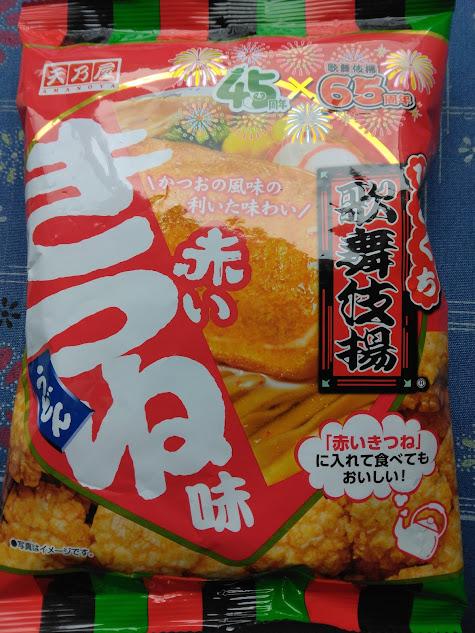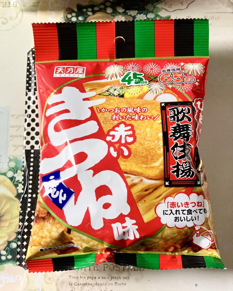 歌舞伎揚げの赤いきつね味がお安くなっていたので思わず購入しました。かわいいサイズの歌舞伎揚げで、カップ麺「赤いきつね」の「お揚げ」をイメージしたような甘辛に味付けされています。けっこう濃いめに仕上がっているので、お茶などと一緒にいただかないと喉が渇きますが、味の傾向としてはかなり好みです。
