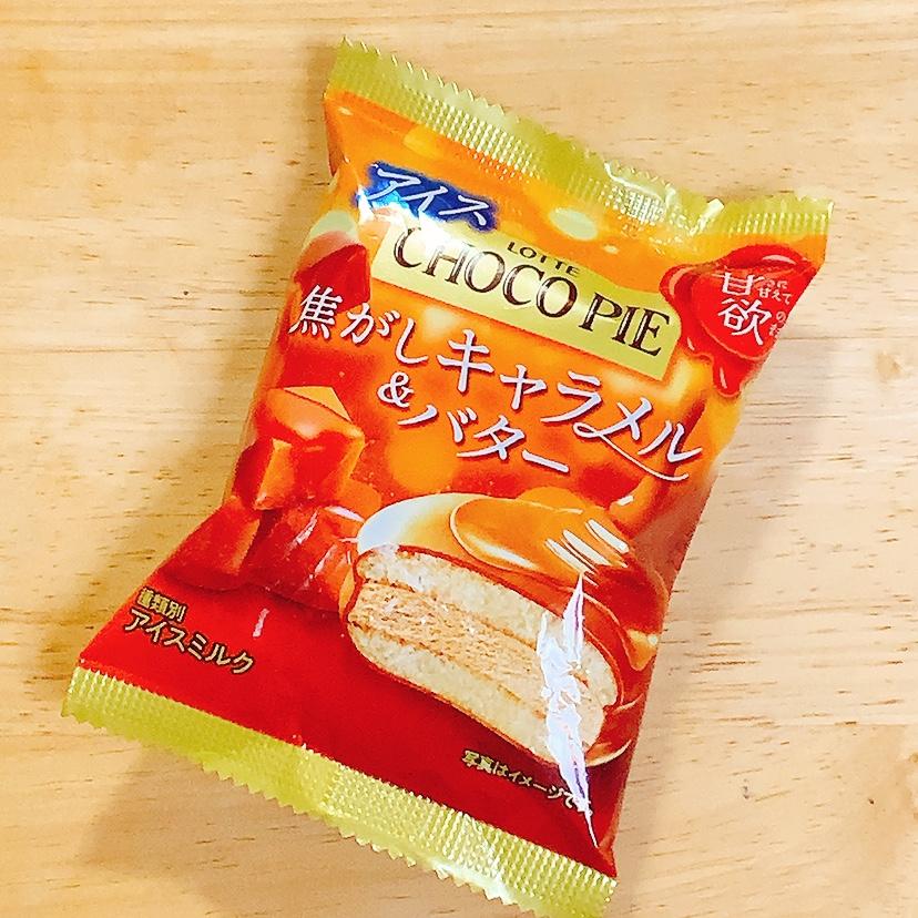 このキャラメル&バター味のチョコパイアイスもついつい心惹かれ手に取りました。