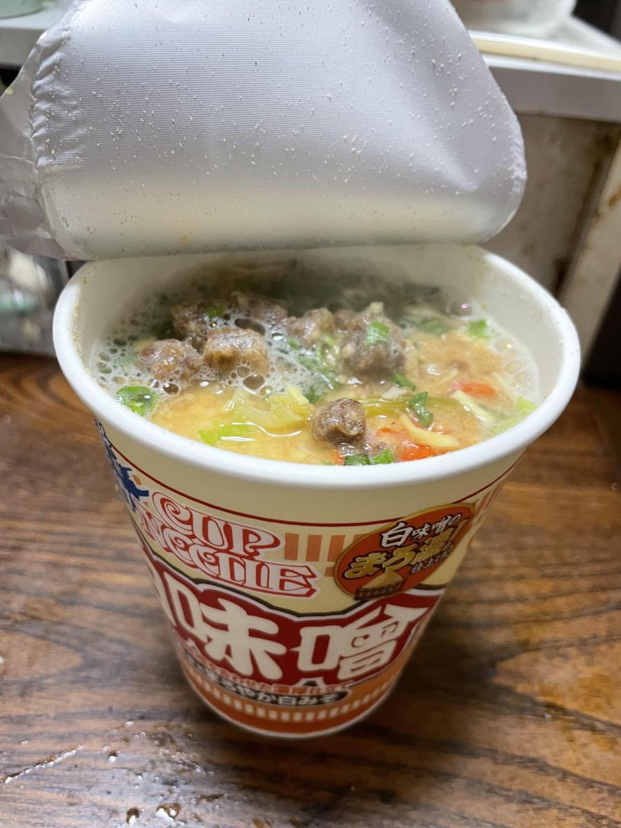 カップヌードルは別添のオイルやシーズニングがないパターンが多いため基本熱湯をかけた時点でスープは溶けだしている印象なのですがこれはこってりと上部に味噌の塊、しっかりと混ぜ込んでいくうちにみるみるスープはこってりに。