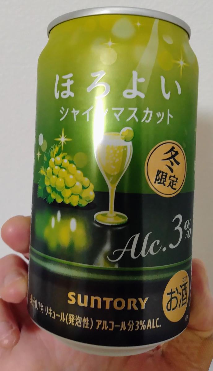 冬季限定のほろよいの新商、シャインマスカットです。クリスマスをイメージしたカラーでいちごとこちらのシャインマスカットが売られていました。みずみずしいシャインマスカットの味わいが微炭酸のシュワっとした刺激とともに口に広がりました。飲みやすい低アルコールのチューハイでとても美味しく飲めました。
