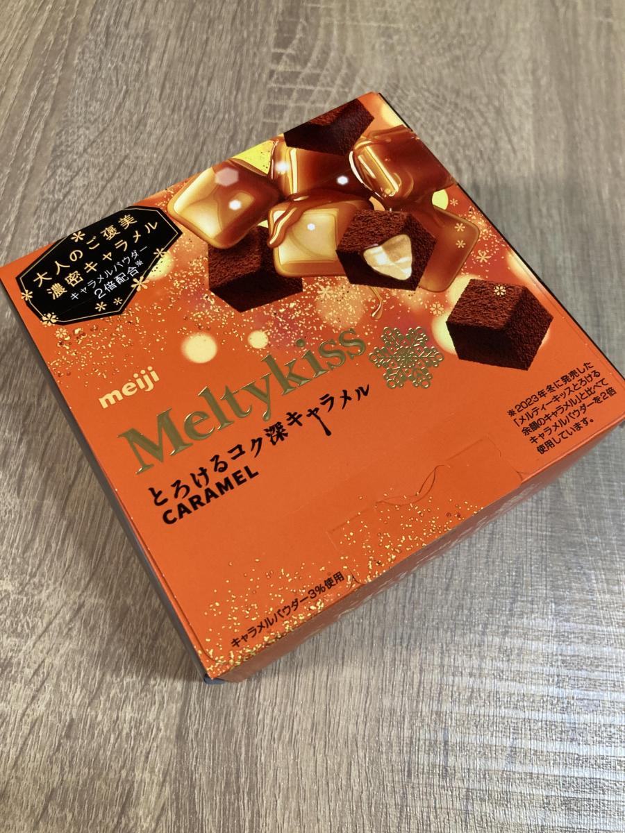 とろけるコク深キャラメルのネーミングとパッケージの色合いに目が惹きどんな味か試したく購入してみました。小分けされているのでシェアできて大変便利です。しっとり、メルティーキッス特有のなめらかさが、口の中ですっと溶けていきます。甘く濃密なキャラメルの風味がたっぷりで、ココアパウダーのほろ苦さの後のミルキーで甘香ばしい濃厚なキャラメルが広がるチョコとキャラメルのバランス良く、大変美味しかったです。