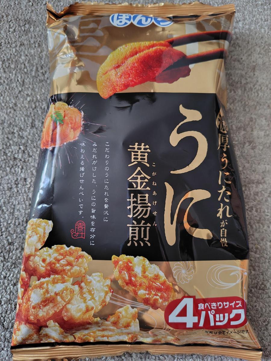 うにの香りがする、サクサク食感の揚げせんです。味付けは濃いのですが薄い部分もあり、バランスがいいです。煌びやかな金色と黒、リアルなうにがのったパッケージも高級感が感じられます。4つ入りなのも湿気ずいつも美味しくていいですね。