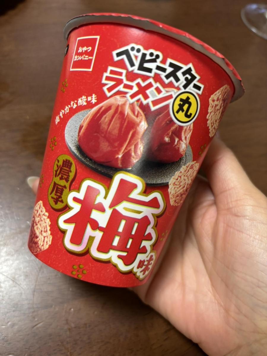 カップ入りのベビースターって珍しいなと思いました。しかも、梅味というので、すごく興味がわきました。
