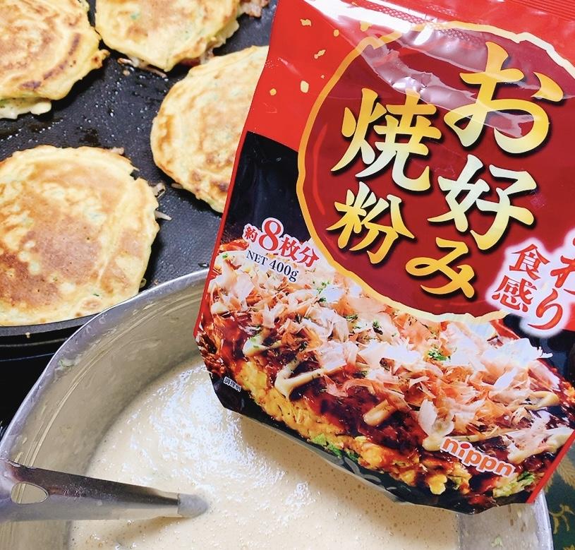 たまに食べたくなるお好み焼。ニップンのお好み焼粉は山いも粉入りでふっくら仕上がり綺麗に焼けるのでいつも利用しています。キャベツの消費もできて何よりもいろんな材料を入れて栄養満点お好み焼にするとバランスも良く美味しい!野菜が苦手な子供達もお好み焼は喜んで食べてくれるので万能メニューです。