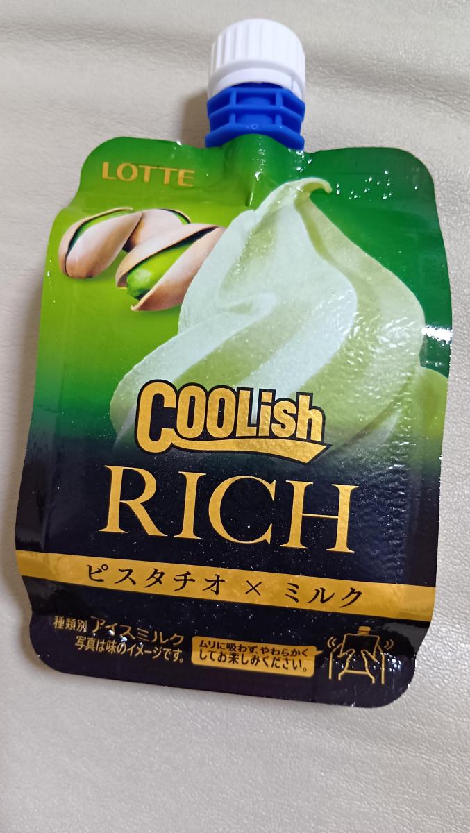 パッケージが何だか高級な感じが気になり購入してみました。少し溶かしてから食べました。微細氷の存在感はあるもののいつものクーリッシュよりもコクがあり、なめらかで柔らかな食感がとてもいいです。まろやかな乳感とともにしっかりピスタチオの風味や香ばしさがあり結構しっかりと甘くほんのり塩味も感じ大変美味しい味わいでした。ピスタチオ好きにはぴったりな味わいで、まさしくリッチな気分になりました。