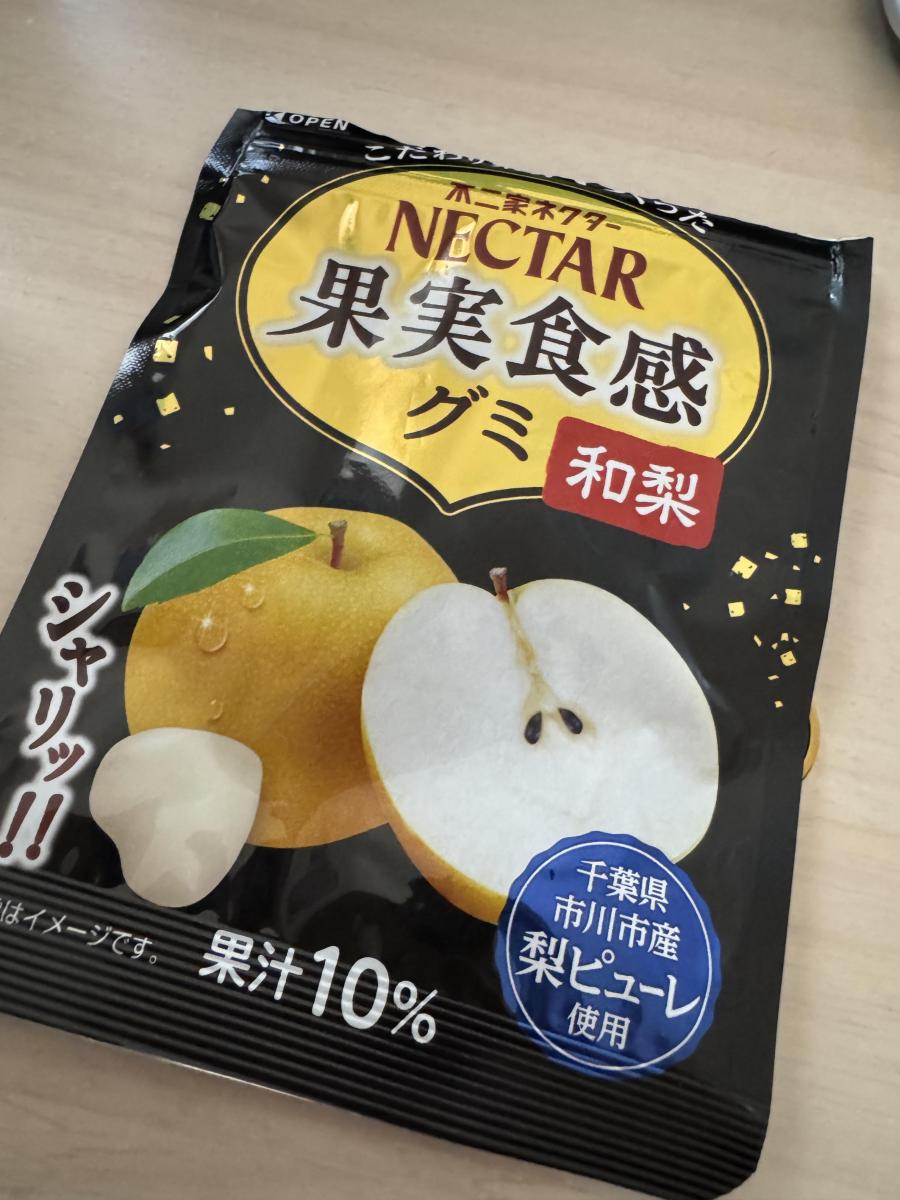 ネクターブランドらしい果汁感高いグミだと思います。千葉県産の和梨を使っていて梨の香りが高く、噛むとシャリッとした梨のような食感とフルーティーな味わいがあります。