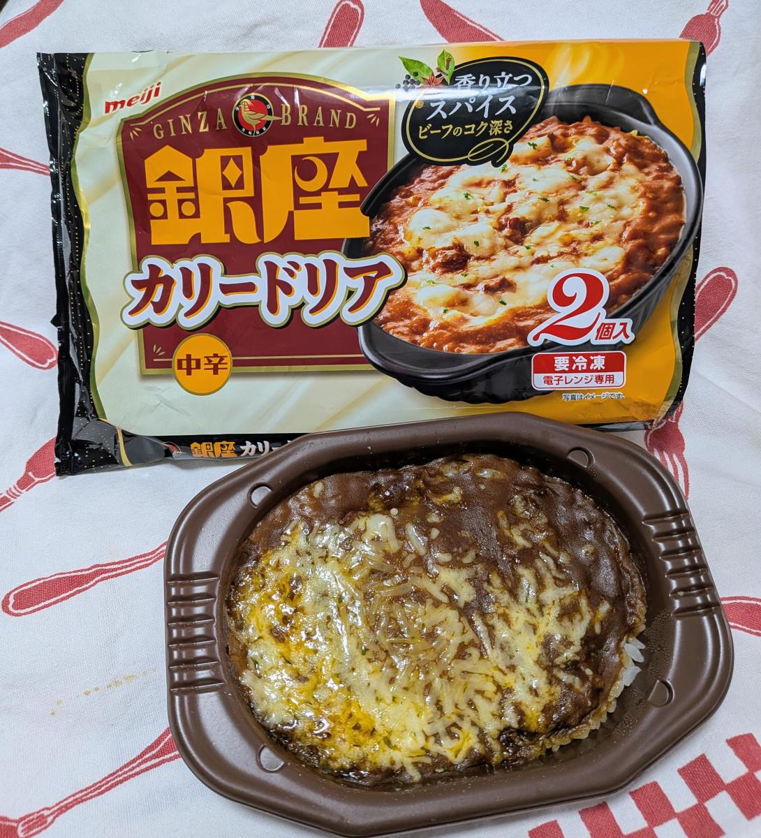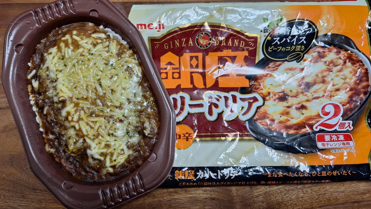 とにかくカレーがおいしいドリアで、それが本格さを感じさせてくれる。レトルトの銀座カレーを食べたことがある人ならすぐにわかる味のカレーで、洋食屋のカレー的なビーフのコクがしっかりとした味わいのなかにピリピリとくるスパイシーさはまさに銀座カレーのあの味だと納得できるもの。ちょっと辛口だけどとてもおいしい。肉も入っていて、サイズは小さいけどもこれもうれしい。チーズはあまりかかってなくて、食べる前はケチっているのかなとも思ったが、あくまでカレーの味わいを主役にするんだなということでこれも納得。ドリアというか焼きカレー的に楽しめる、そういう商品だなと思った。