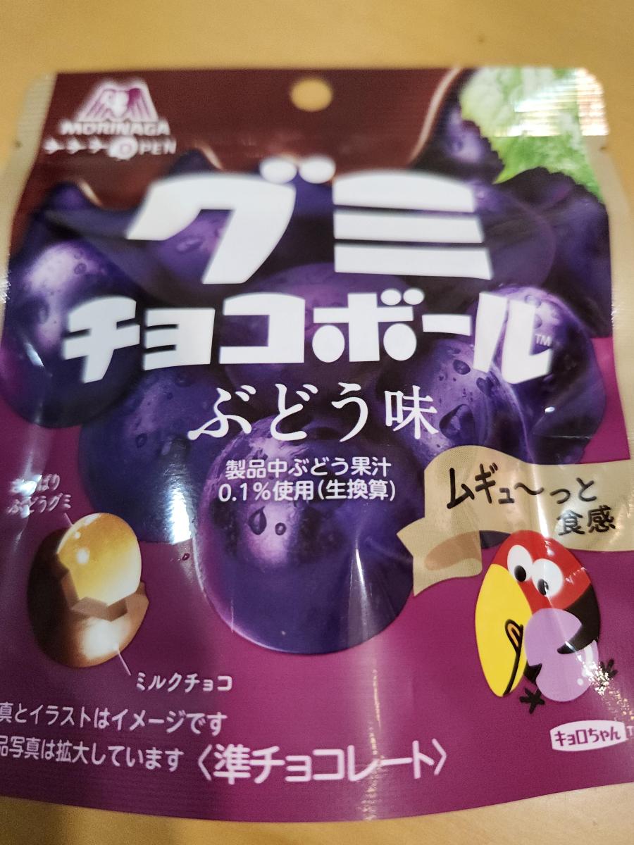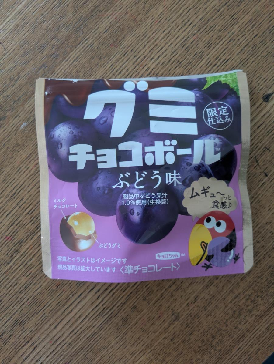 中のブドウ味のグミが美味しいのですが、そしてチョコも好きなのですが、お互いが主張が強すぎて味の邪魔をしてしまっている気が個人的にはします。外のチョコもブドウ味だったらどうでしょうね。