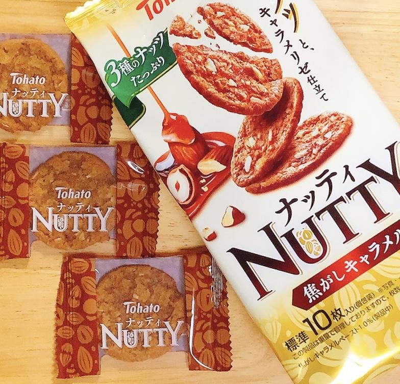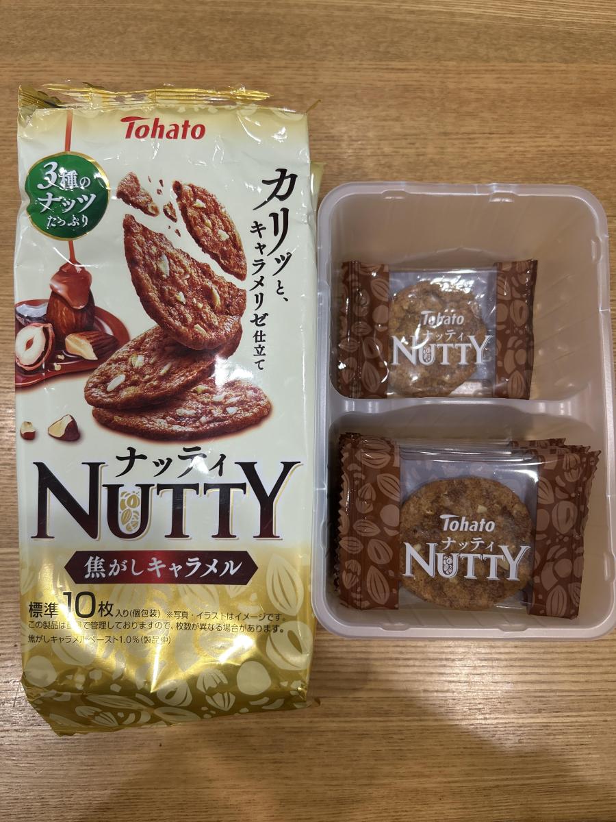 焦がしキャラメルの甘香ばしさとナッツの香ばしさがクセになるおいしさ!薄焼きのクッキーでキャラメリゼのようなおいしさ。コーヒーと相性が良いし、個包装で小さめサイズだからシーン問わず食べやすい。期待ほどナッツ感はなかったけど、1枚で満足感が高いキャラメルクッキー!