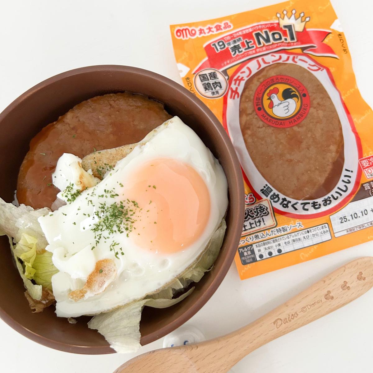 湯煎して温めたチキンハンバーグと目玉焼きとレタスを、ご飯に乗せてロコモコ風にアレンジして食べるのがお気に入りです。