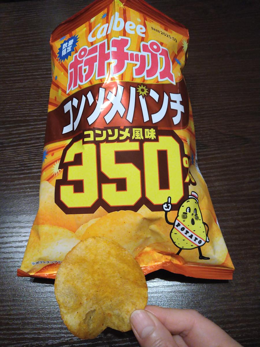 カルビーのポテトチップスは芋感たっぷりなのが良いですね。こちらは通常の350%のコンソメということで、濃厚な味わいで美味しいです。