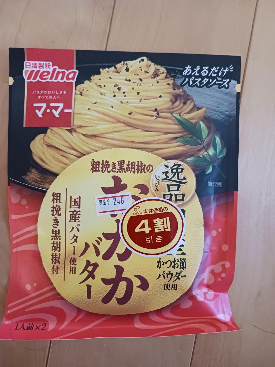 おかかバターってどんな味なのかなと気になったのとお店で安くなっていたということもあり買ってみました。粗挽き黒胡椒も付属されていましたが、子どもと食べるため使わなかったですが、おかかバターの香ばしいよい香りがして、おいしかったです。茹でたパスタとあえるだけで簡単なので時短できてよいです。