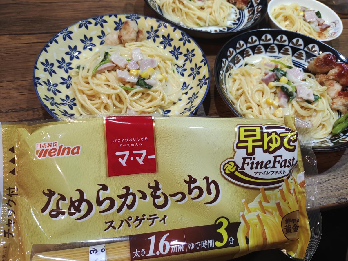 最近はママーの湯で時間が短いパスタを買っています。これはAmazonでセールになっていて初めて買ってみました!