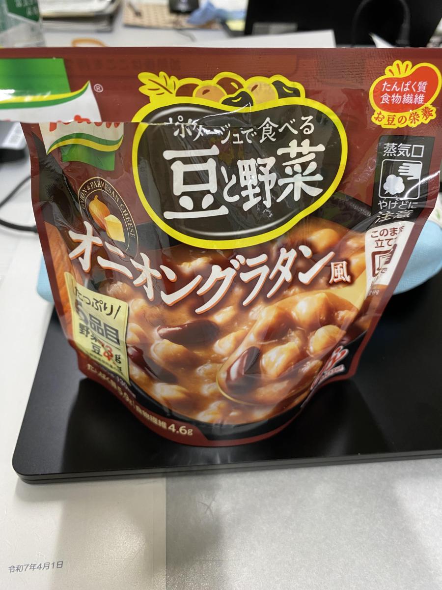 朝ごはんをパンとスープで済ます時に、レンチンで温めることが出来て助かっています。茶色いスープの中で黄色いひよこ豆と赤いんげん豆が鮮やかです。ひよこ豆は少しかためで歯ごたえがあります。赤いんげん豆はほっこりとしていて、なめらかな食感です。グラタン感は言われてみたらという感じですが、玉ねぎの香ばしい風味とコクに深みがありました。とろっとしていて、具だくさんなポタージュで栄養がたっぷり詰まっているのが分かる味でした。