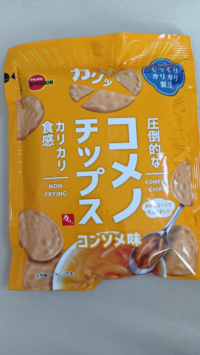 コメノチップス?おせんべいでは?と頂いたのですが、おせんべいとはちょっと違う、成形チップスのようで、お米の味だけでなく、コーンの風味も若干感じます。