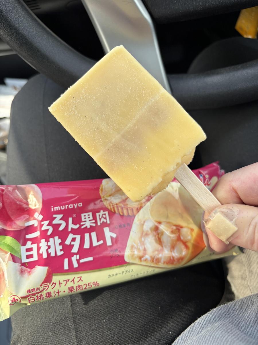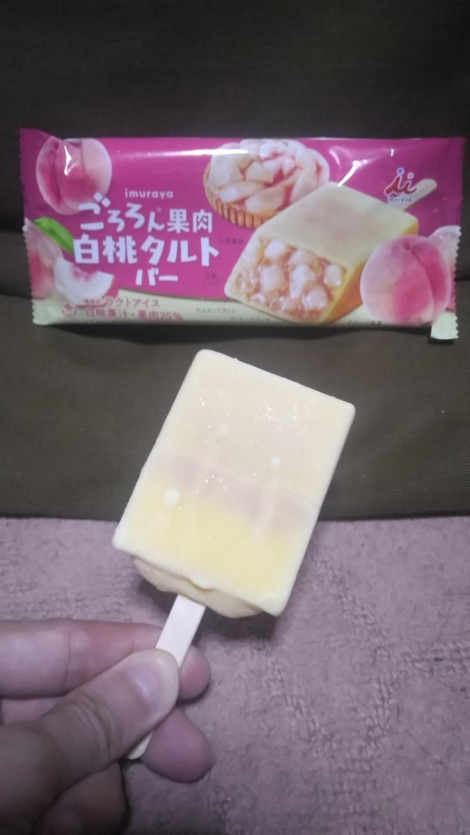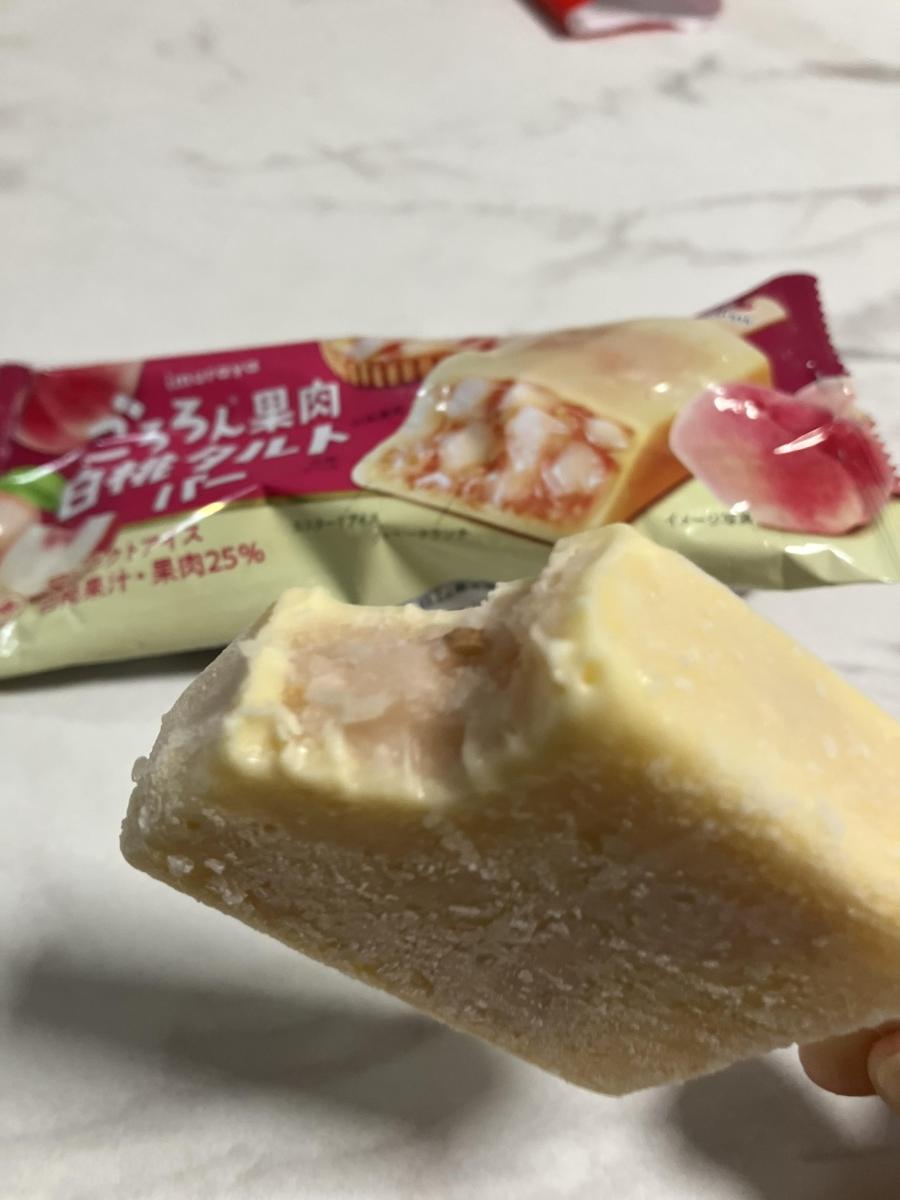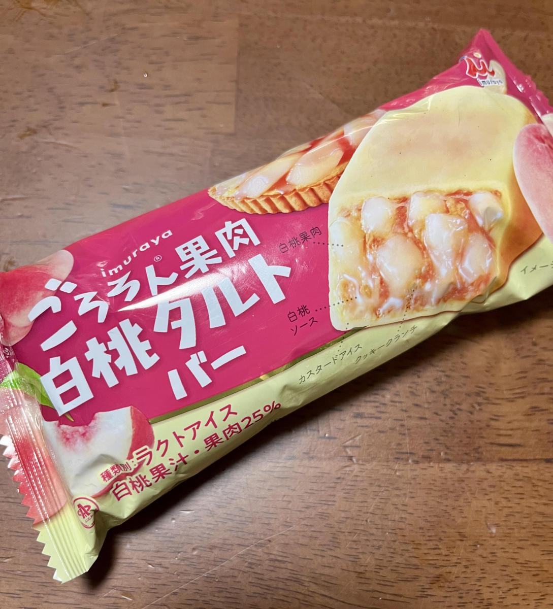 パッケージの断面写真がとても美味しそうで…購入しました。白桃果汁・果肉25%使用しています!周りはバニラビーンズを使用したカスタードアイスでこれだけでも美味しいです。中の白桃果肉の存在感がすごいです。ごろごろ入ってます。満足感がありすぎます。クッキークランチが入っており、タルト感を演出していますが正直存在感はないです。ですが、全体としてとても美味しいです!またリピしたいです!