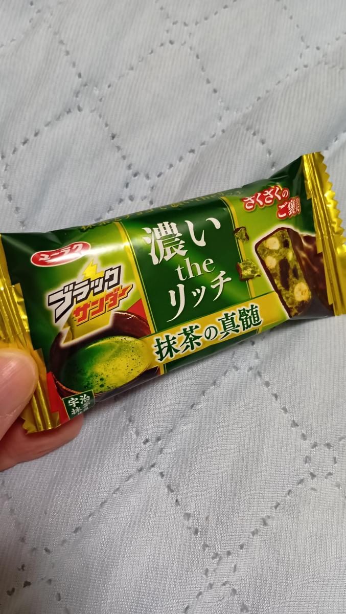 甘いチョコの中に抹茶の風味がちゃんと濃くて、抹茶好きにはたまらない味です。ザクザクした食感そのままに贅沢感も感じます。普通のタイプのブラックサンダーより、ちょっと高いですが納得のクオリティだと思います。